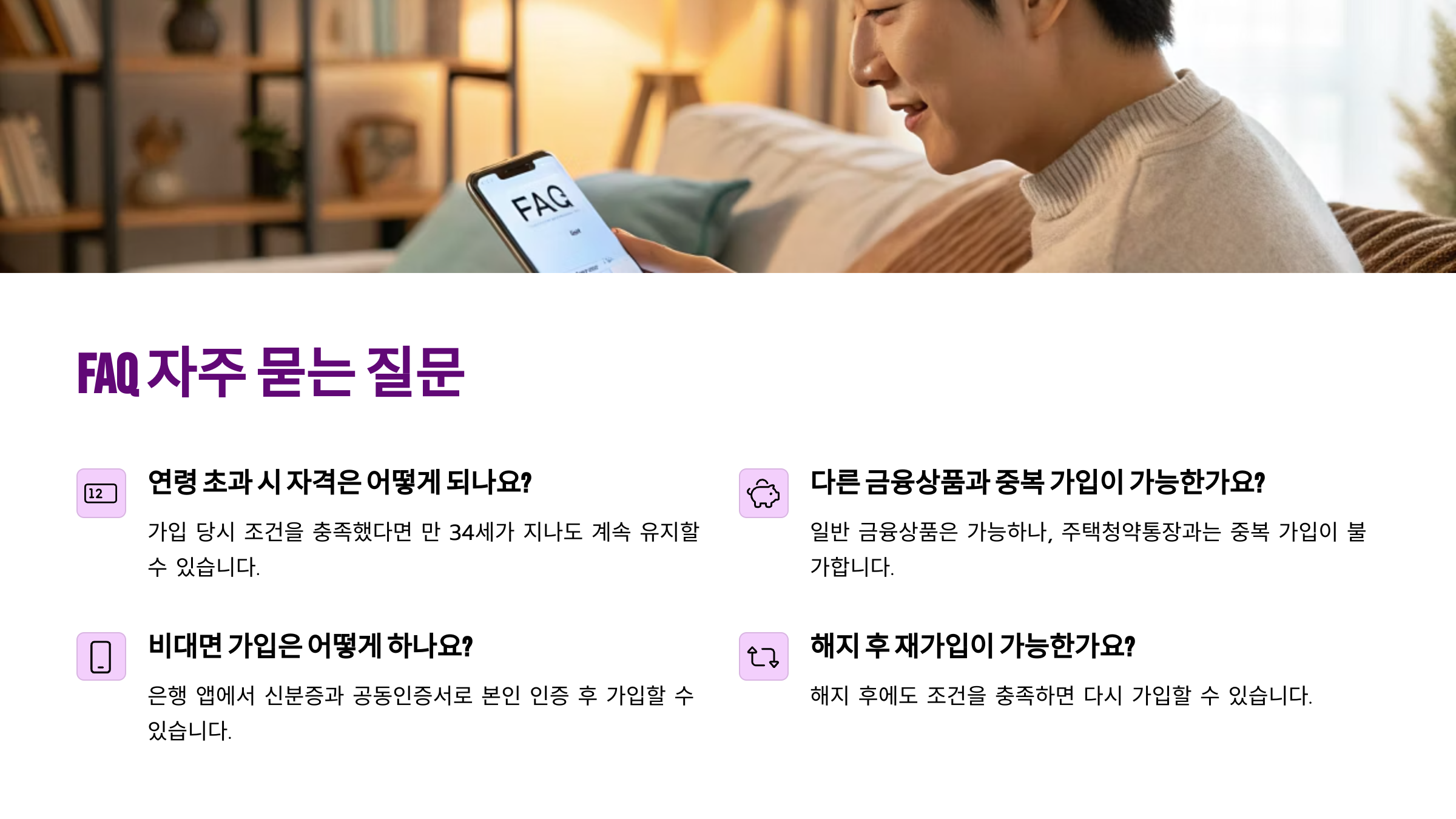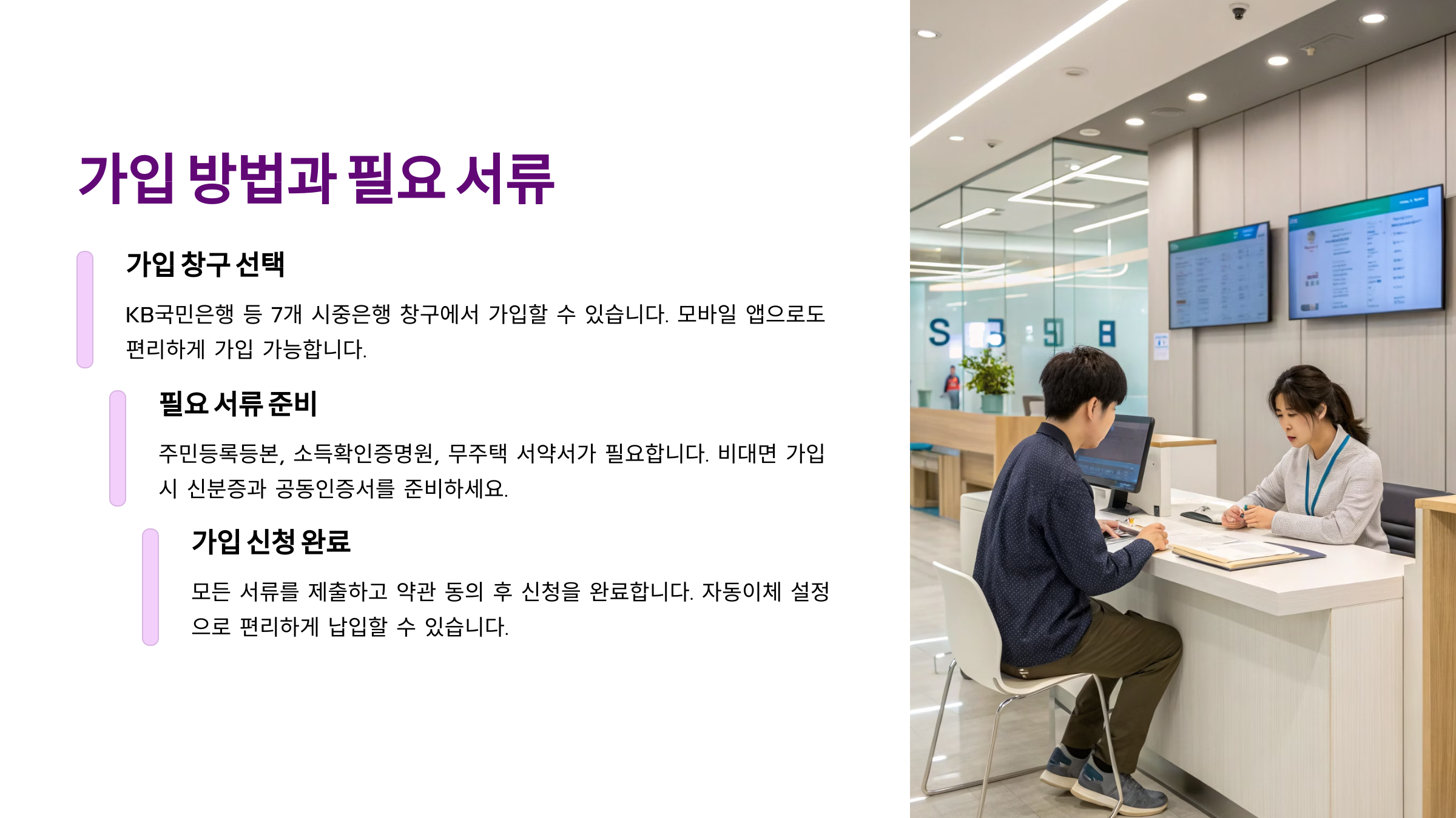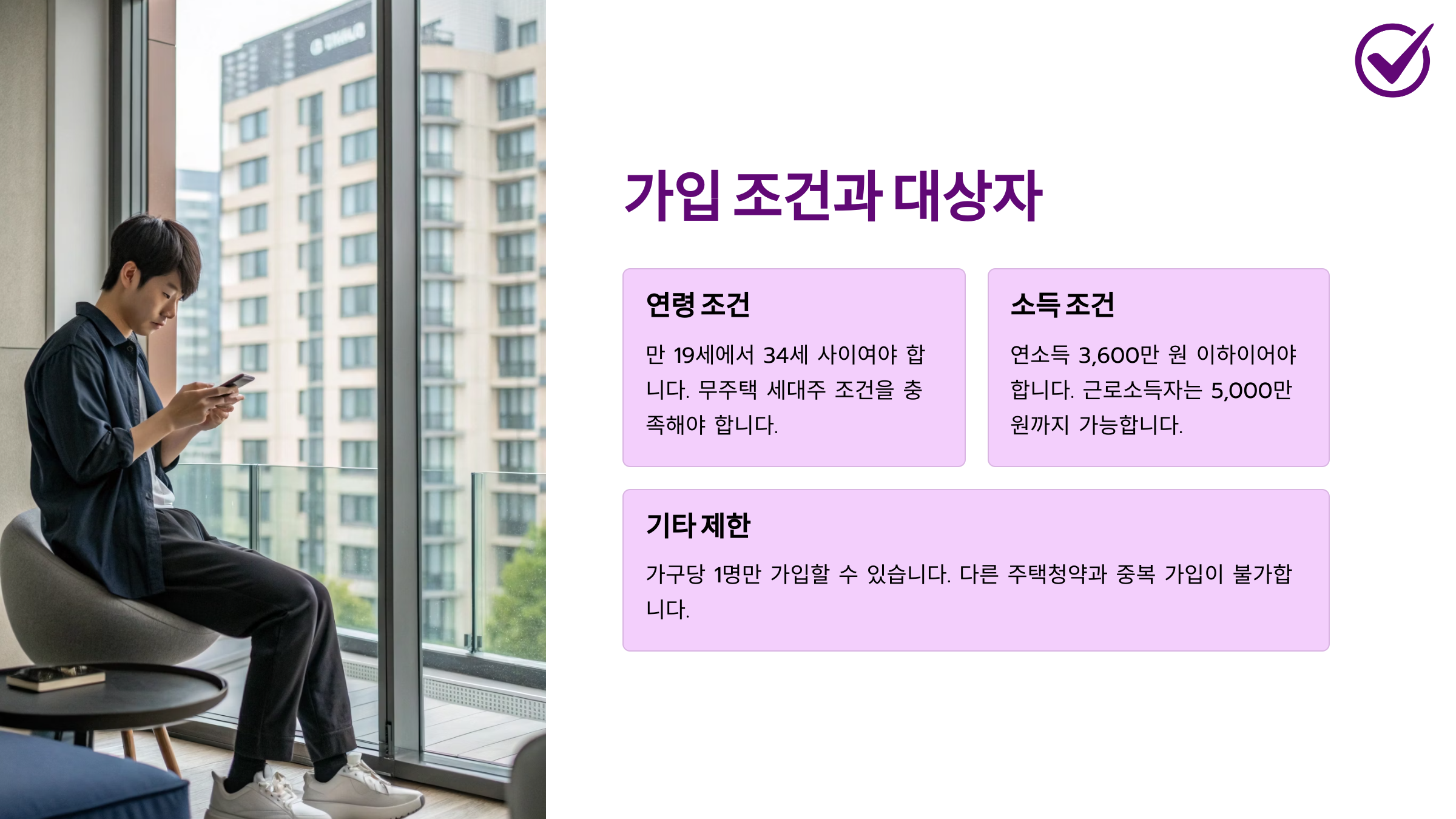 가입 조건이 명확하게 정해져 있기 때문에 본인의 나이, 소득, 주거 상태 등을 체크해보는 게 가장 먼저 해야 할 일이에요. 각 은행 홈페이지나 국민은행, 우리은행, 농협 등 영업점에서도 확인할 수 있어요!