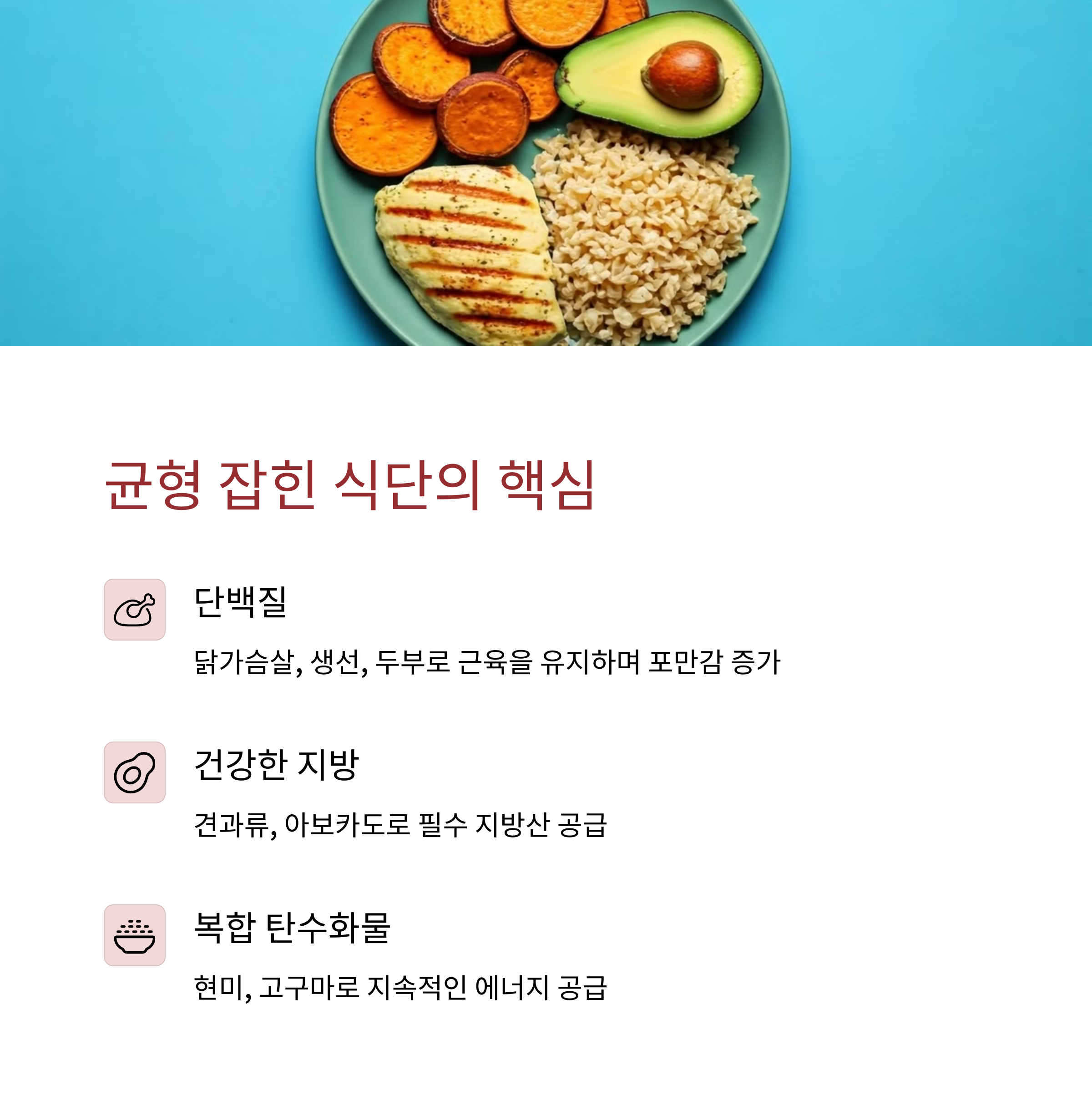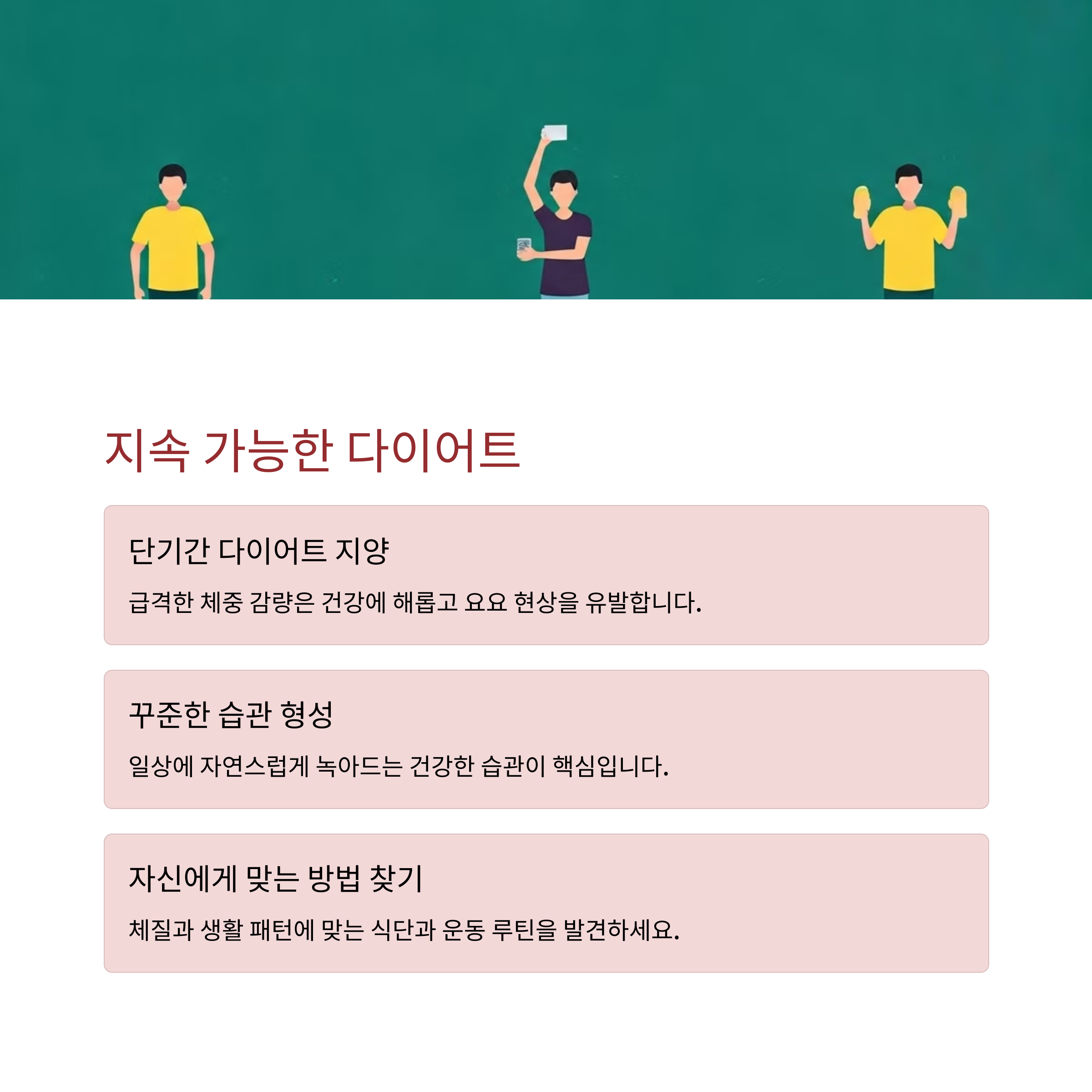 | 지속 가능한 식습관 만들기 | 유산소 + 근력 운동 병행 | 탄수화물과 단백질 균형 |