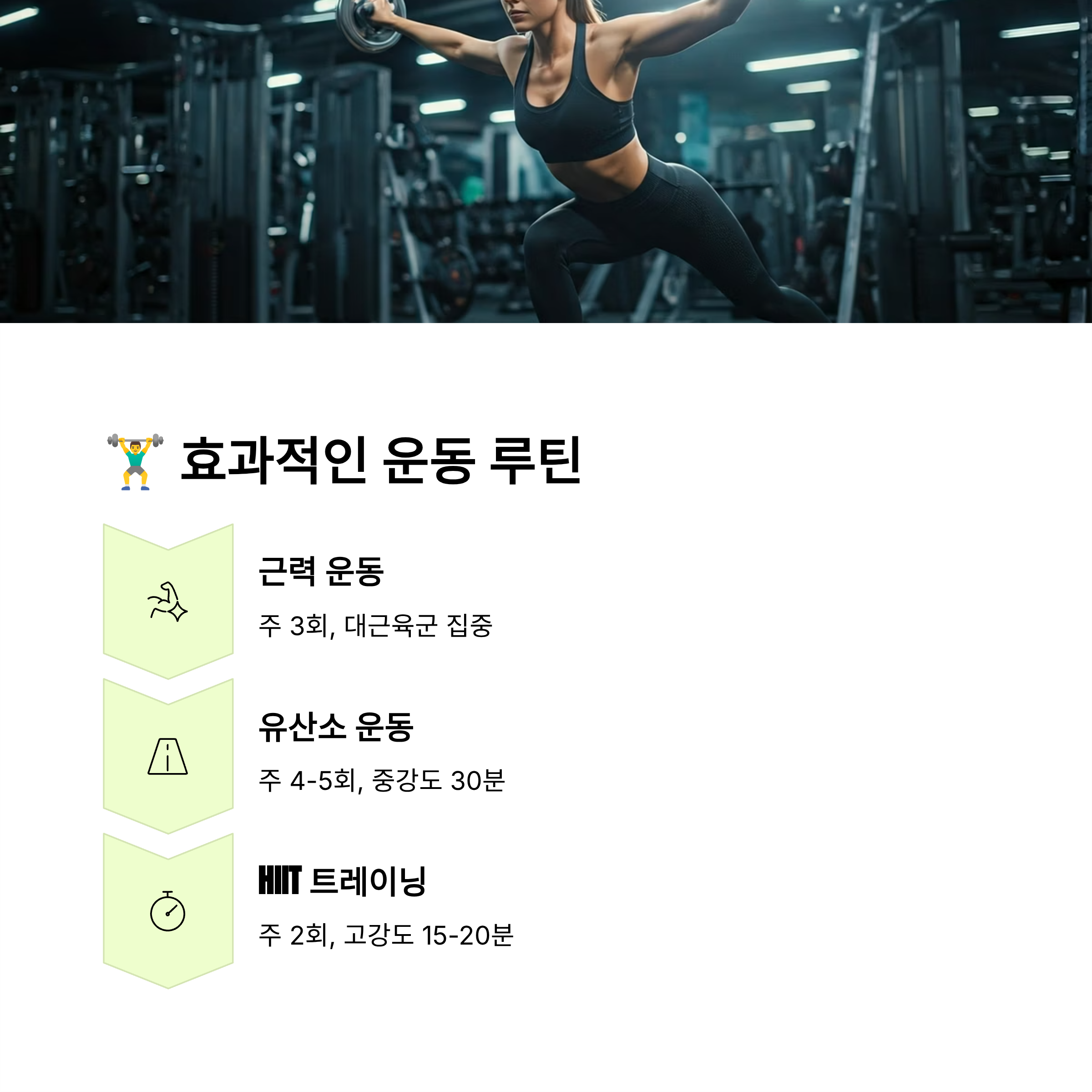 | 유산소 운동 | 주 3~5회, 30분 이상 (걷기, 조깅, 수영), HIIT | 체지방 직접 소모, 심폐 기능 향상 |