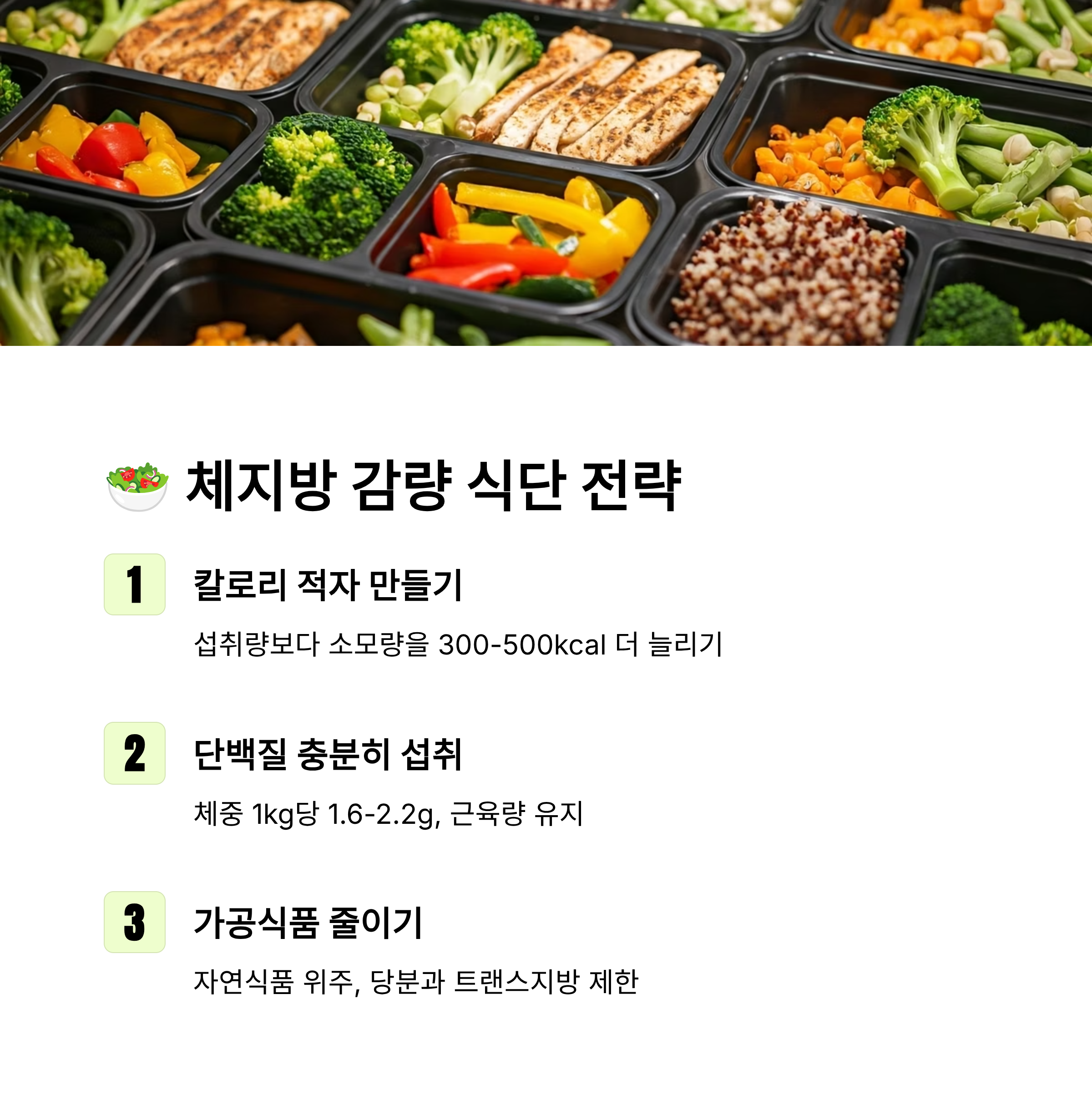 체지방 감량은 단순히 굶는 것이 아닌, 꾸준한 식단 관리와 운동을 통해 건강한 습관을 만드는 과정입니다. 이제 식단 전략을 알아볼까요? 🥗
