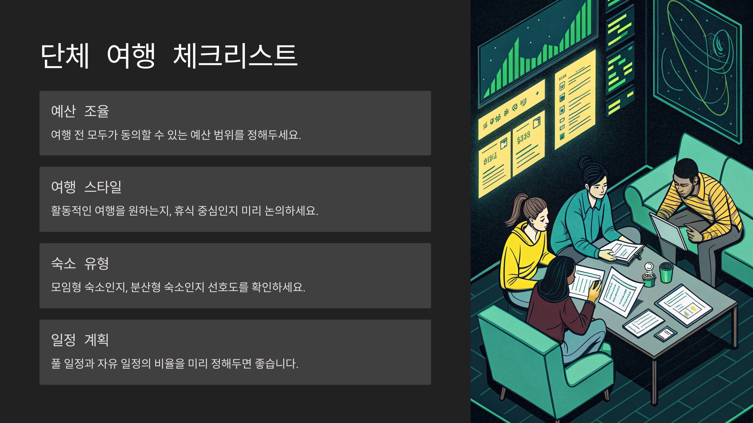 단체 여행일수록 사전에 정해야 할 항목이 많습니다.