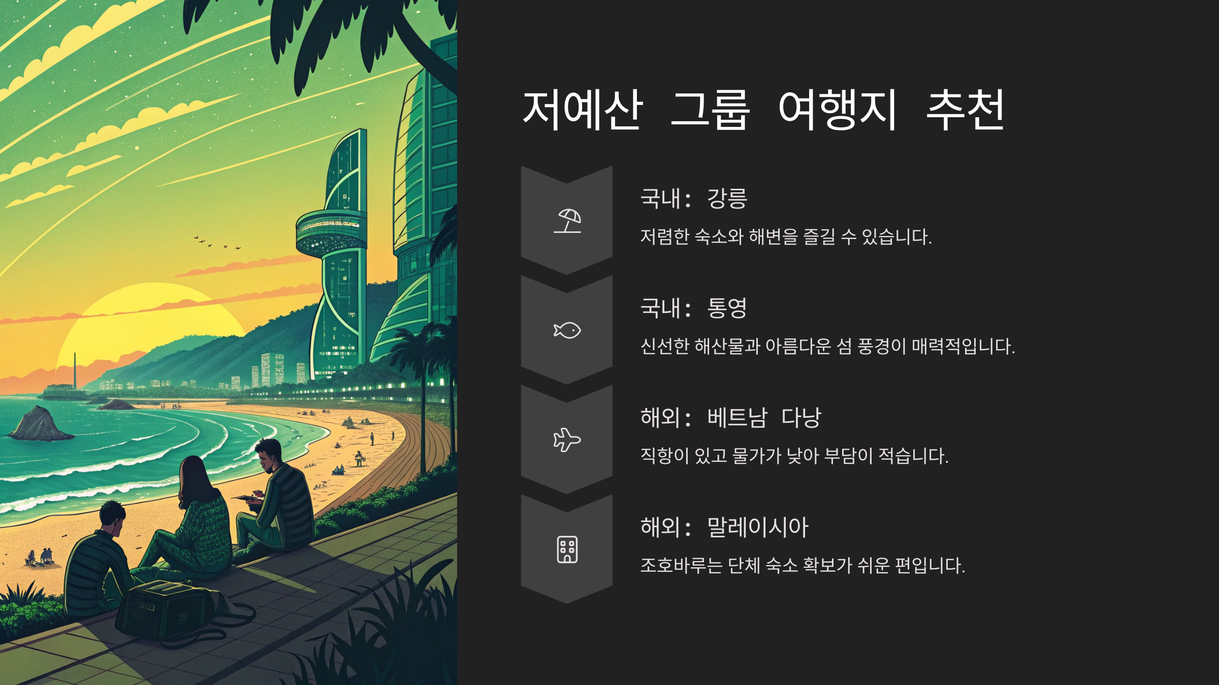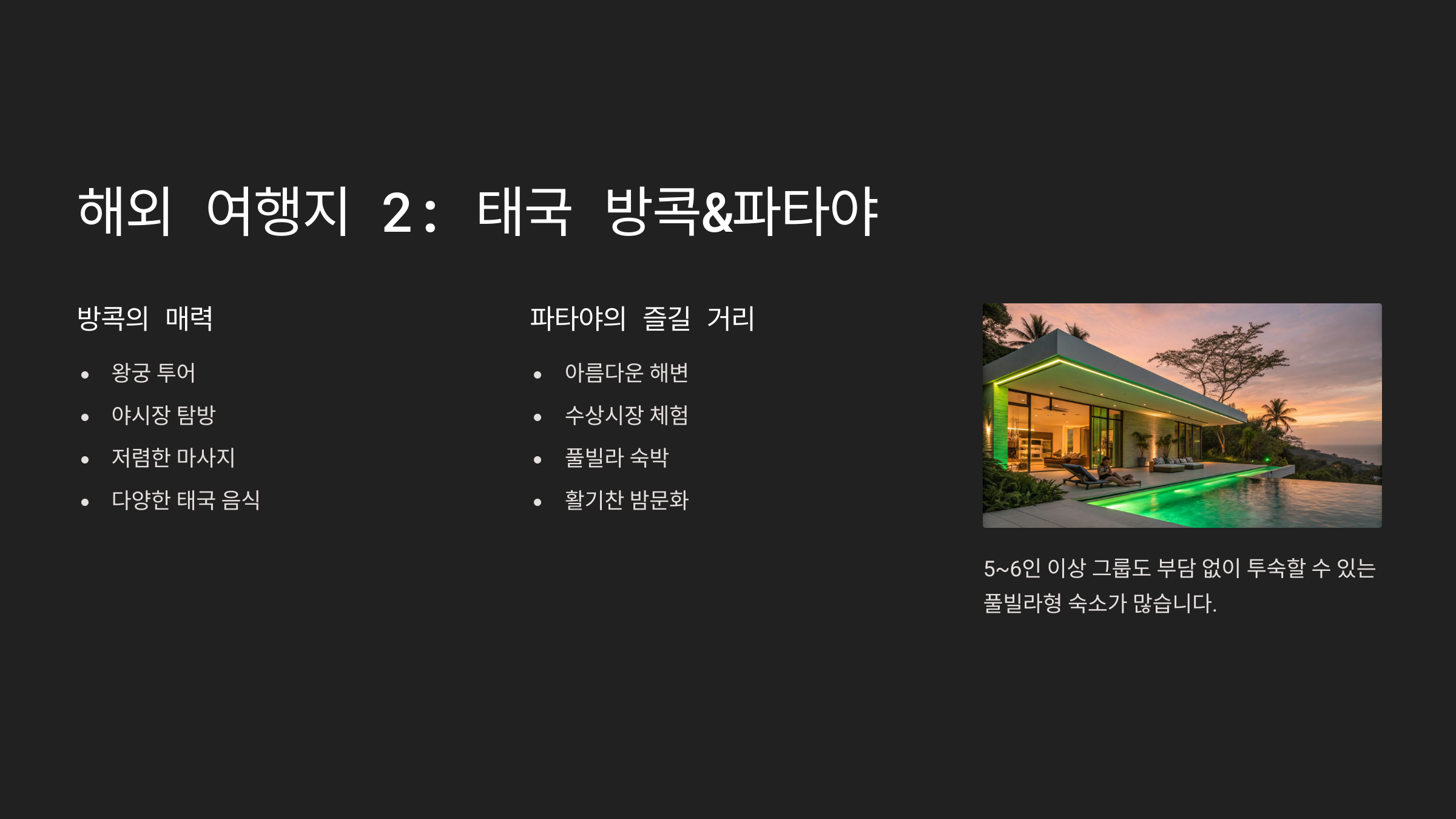 | 휴양+유흥 | 파타야, 오사카 | 쇼핑, 야시장, 풀빌라 숙박 가능 |