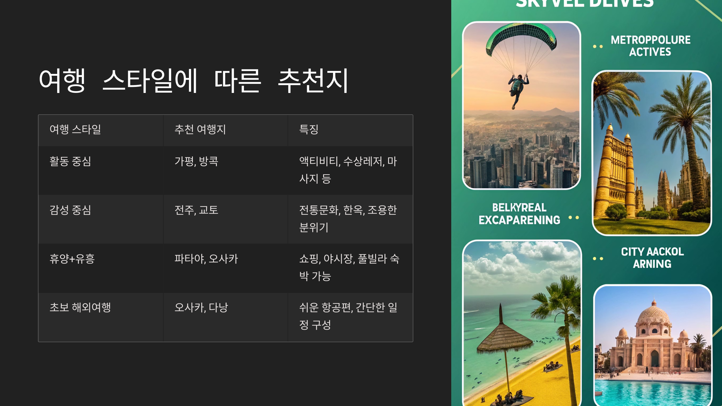 여행 스타일에 따른 추천지 요약표