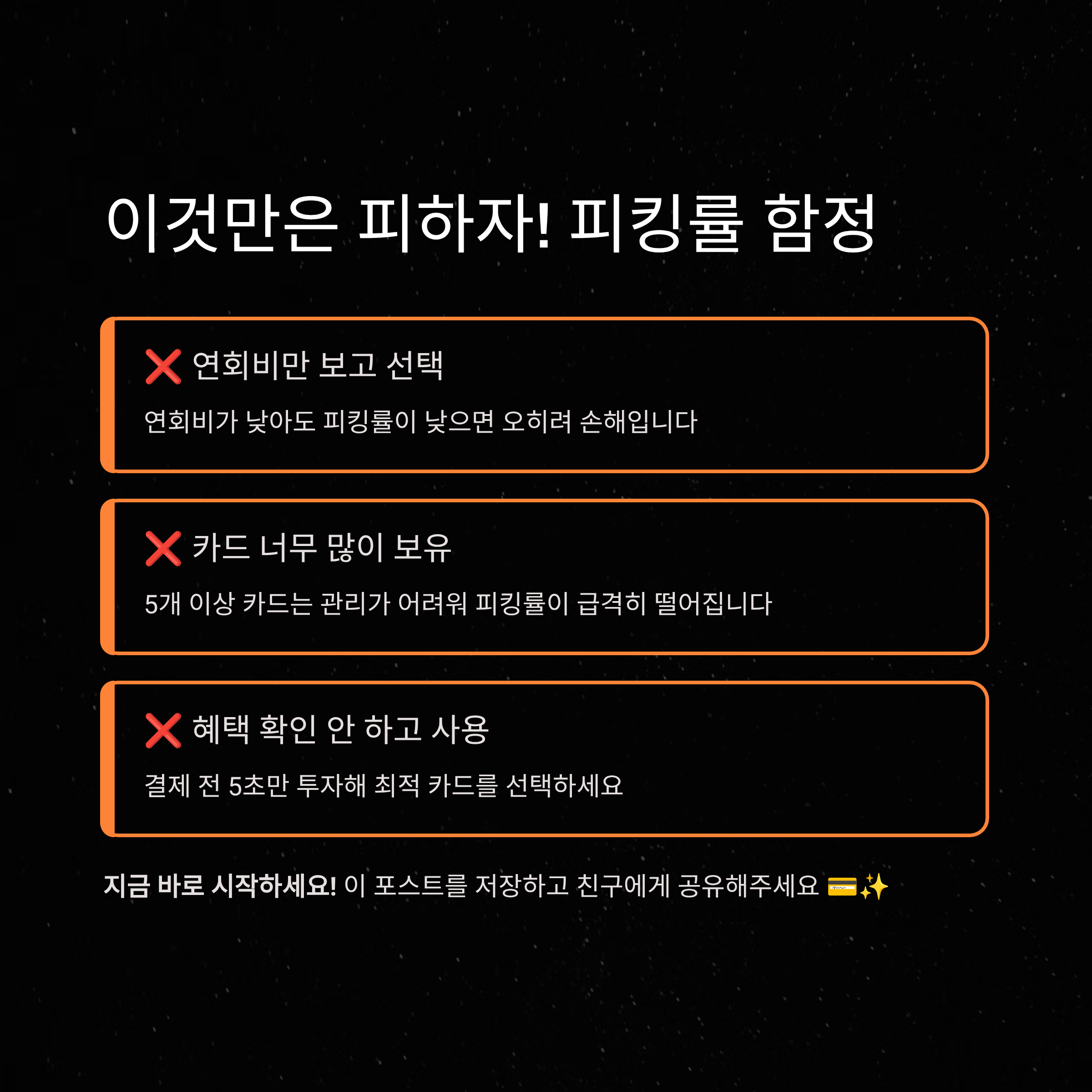 - 연회비의 함정: 연회비가 비싼 카드는 그만큼 많은 혜택을 제공하지만, 내가 그 혜택(공항 라운지, 호텔 바우처 등)을 100% 활용하지 못한다면 오히려 손해입니다. 내 라이프스타일에 맞지 않는 혜택은 0원입니다.