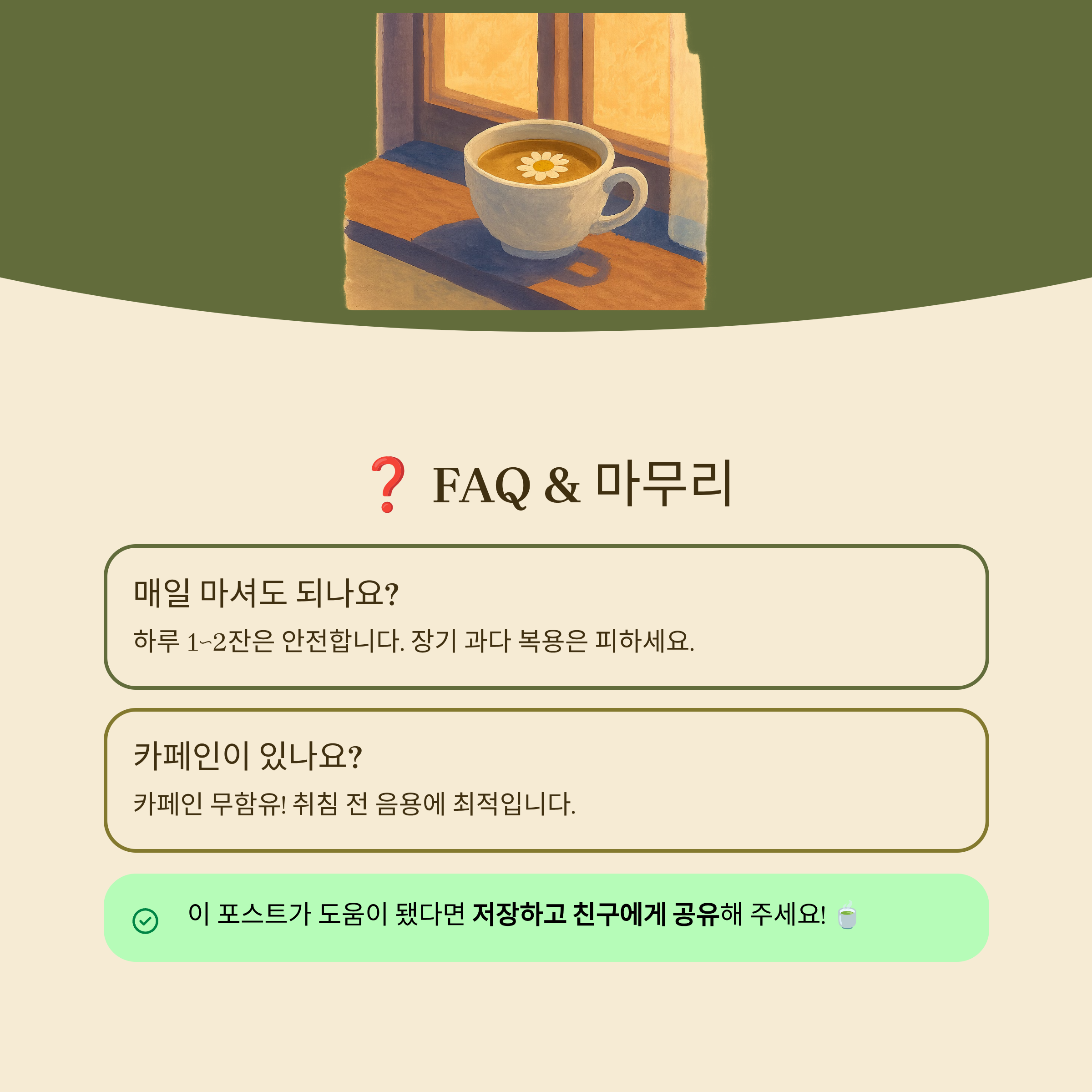 4. 음용 시기: 잠들기 30분~1시간 전에 마시면 숙면 효과가 극대화됩니다.