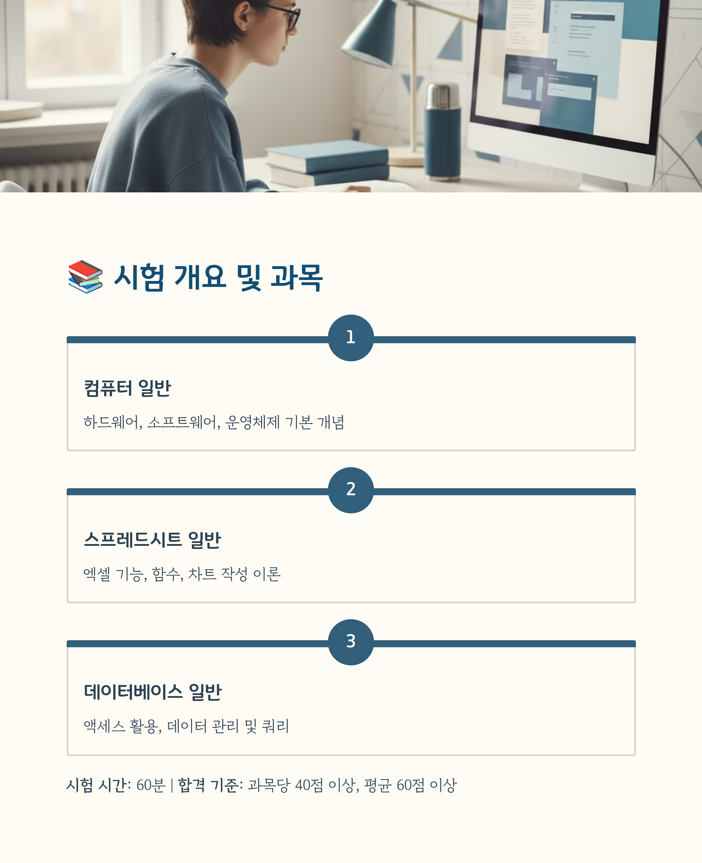 | 시험 과목 | 컴퓨터 일반, 스프레드시트 일반, 데이터베이스 일반 (총 3과목) |