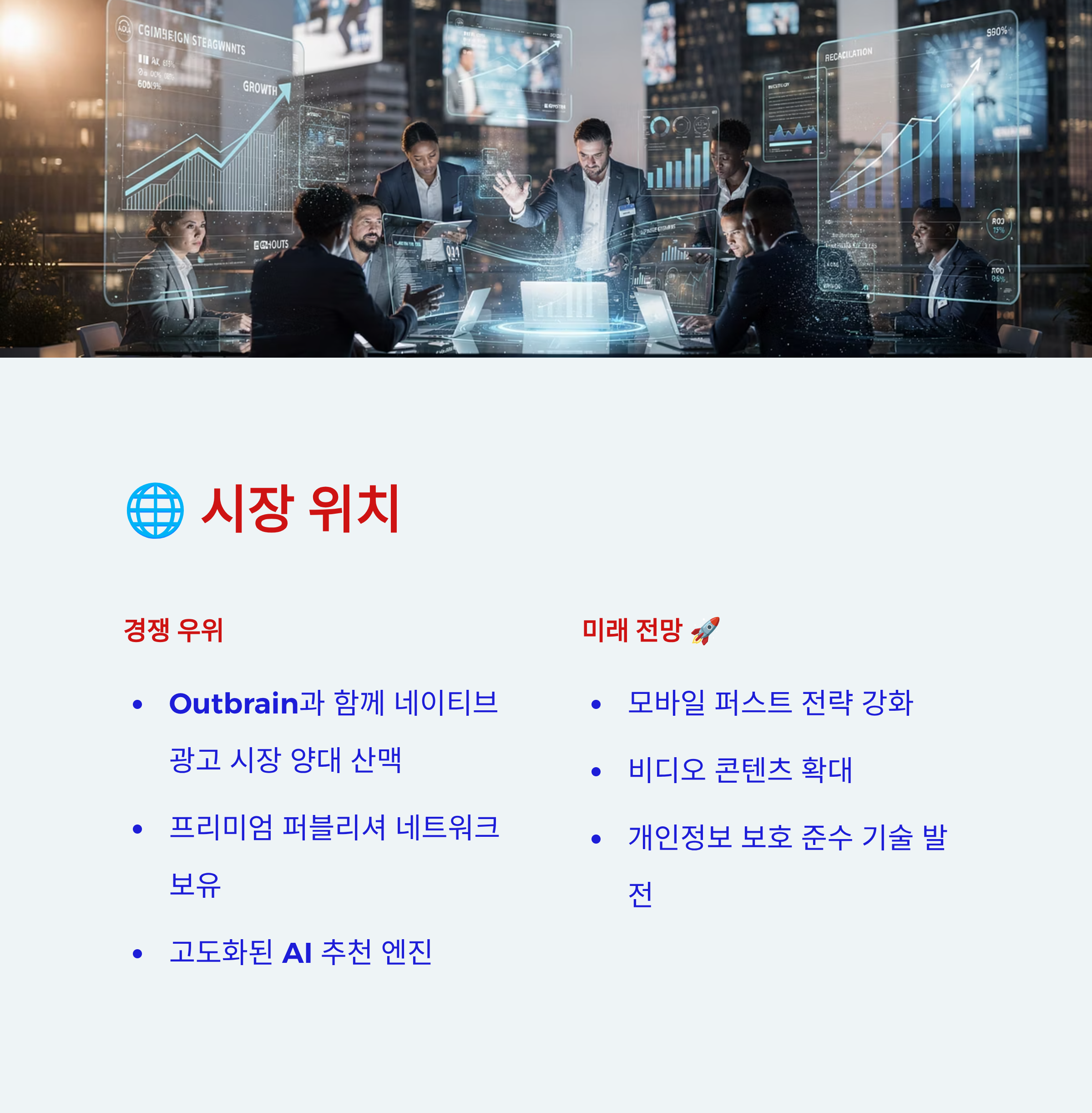 - 네이티브 광고 시장의 성장: 사용자들이 기존 광고에 대한 피로도를 느끼면서 더욱 자연스러운 네이티브 광고의 수요는 계속 증가할 것으로 보입니다. 타불라는 이러한 시장 트렌드의 직접적인 수혜자입니다.
