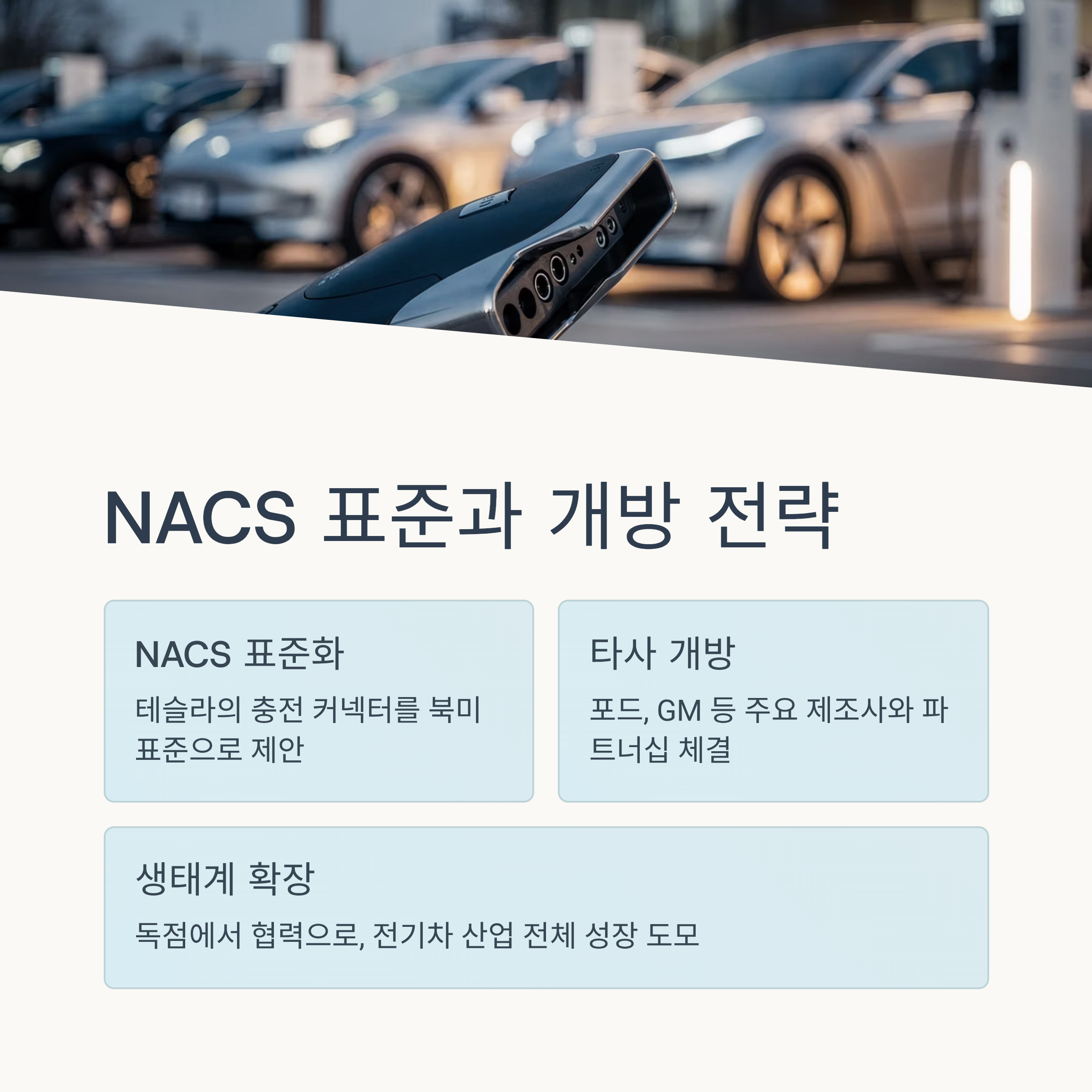 - 포드, GM, 리비안, 현대차그룹 등 북미 시장의 주요 자동차 제조사들이 NACS를 채택하고 슈퍼차저 네트워크를 이용하겠다고 발표하면서, NACS는 북미 고속 충전 표준으로 빠르게 자리 잡고 있습니다.