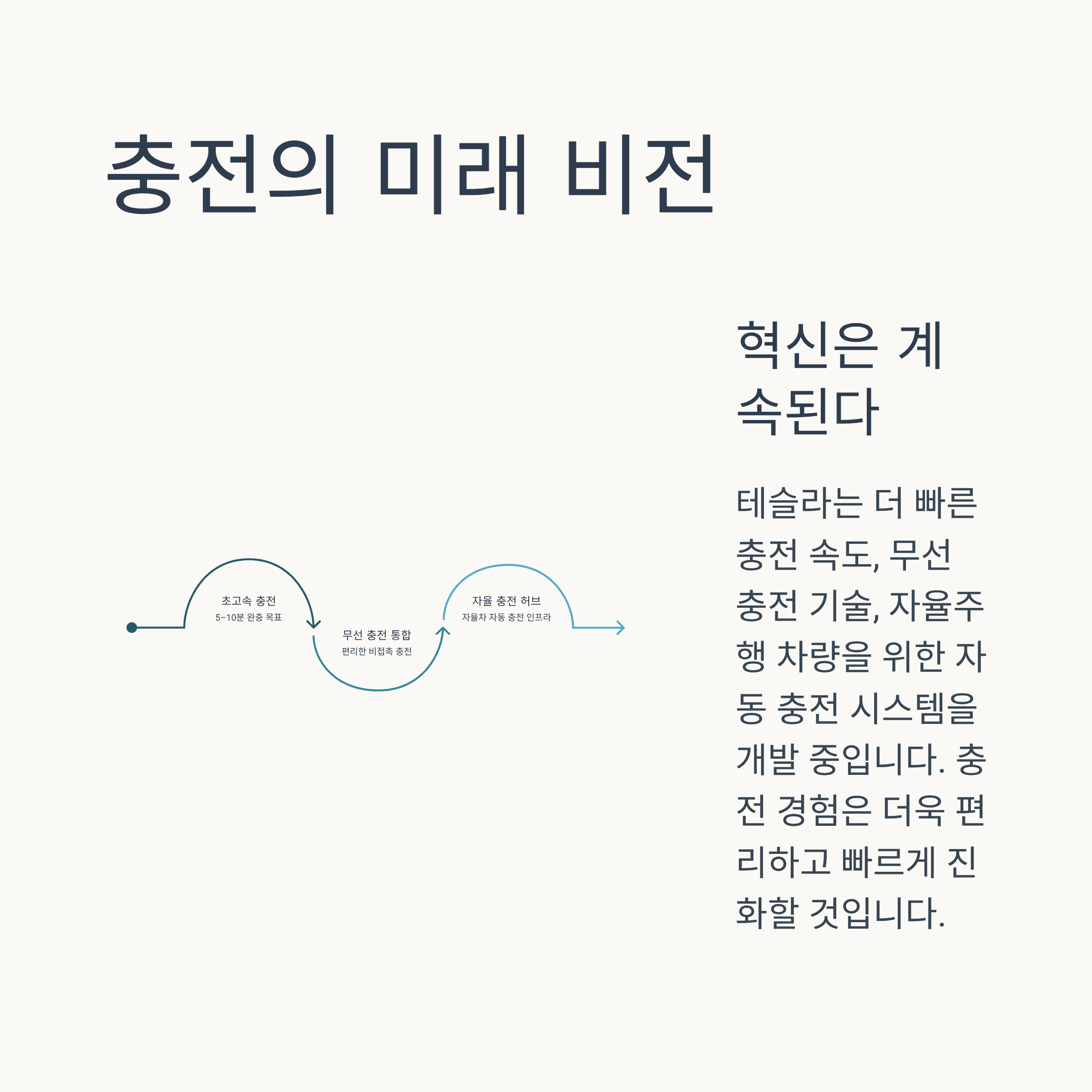 - 로보택시 충전 인프라: FSD(Full Self-Driving) 기술과 연계하여 운전자 없는 로보택시가 스스로 충전소를 찾아 충전하는 시스템 구축이 테슬라의 궁극적인 비전 중 하나입니다.