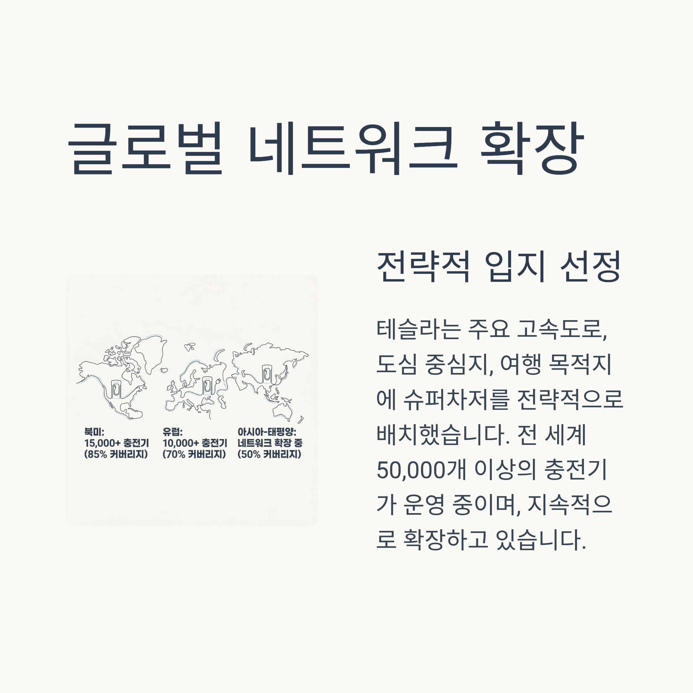- 글로벌 로드맵: 북미, 유럽, 아시아 등 전 세계 주요 지역에 슈퍼차저 스테이션을 구축하여 테슬라 운전자들이 어디든 편안하게 여행할 수 있도록 했습니다.