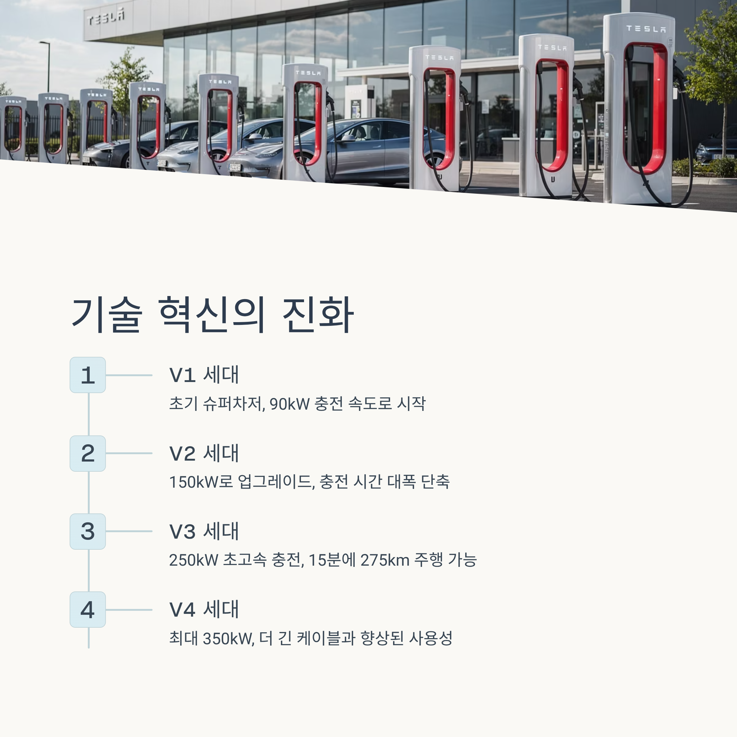 - V1 슈퍼차저 (2012년): 최대 120kW 충전 속도. 당시로서는 혁신적인 속도였으며, 약 30분 만에 80% 충전이 가능했습니다.