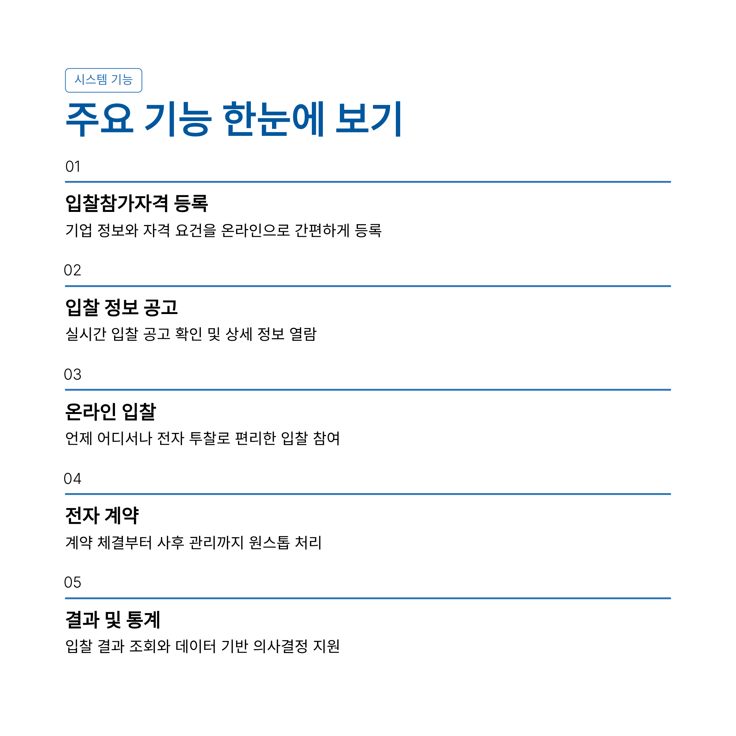 - 투명성 및 공정성 확보: 입찰 공고부터 심사, 계약 체결까지 모든 과정이 온라인으로 공개되어 투명하고 공정한 경쟁을 유도합니다.