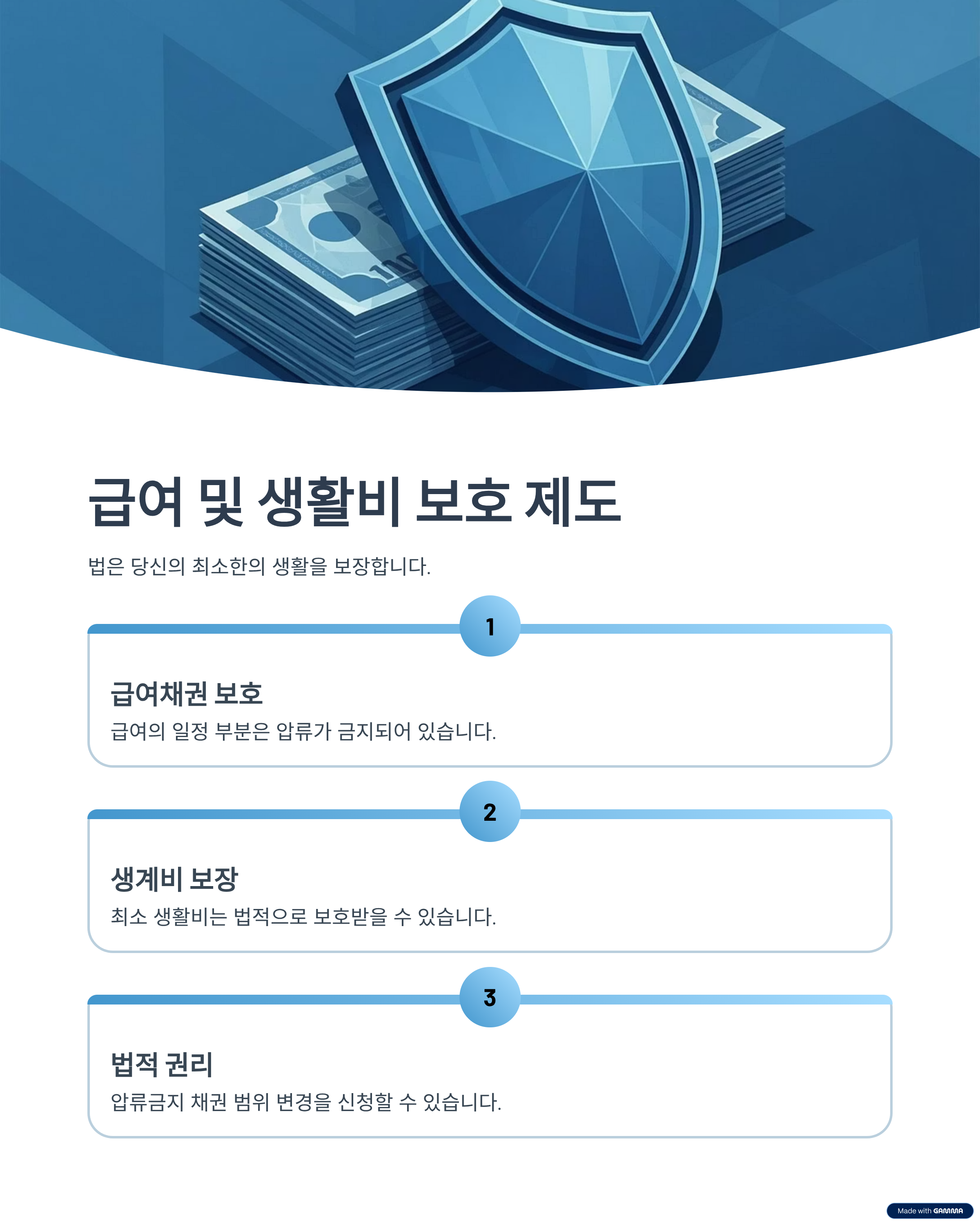 통장압류가 되었더라도, 우리 법은 채무자의 최소한의 생활을 보장하기 위한 제도들을 마련하고 있습니다. 급여 및 생활비 보호를 위한 핵심 제도는 다음과 같습니다.