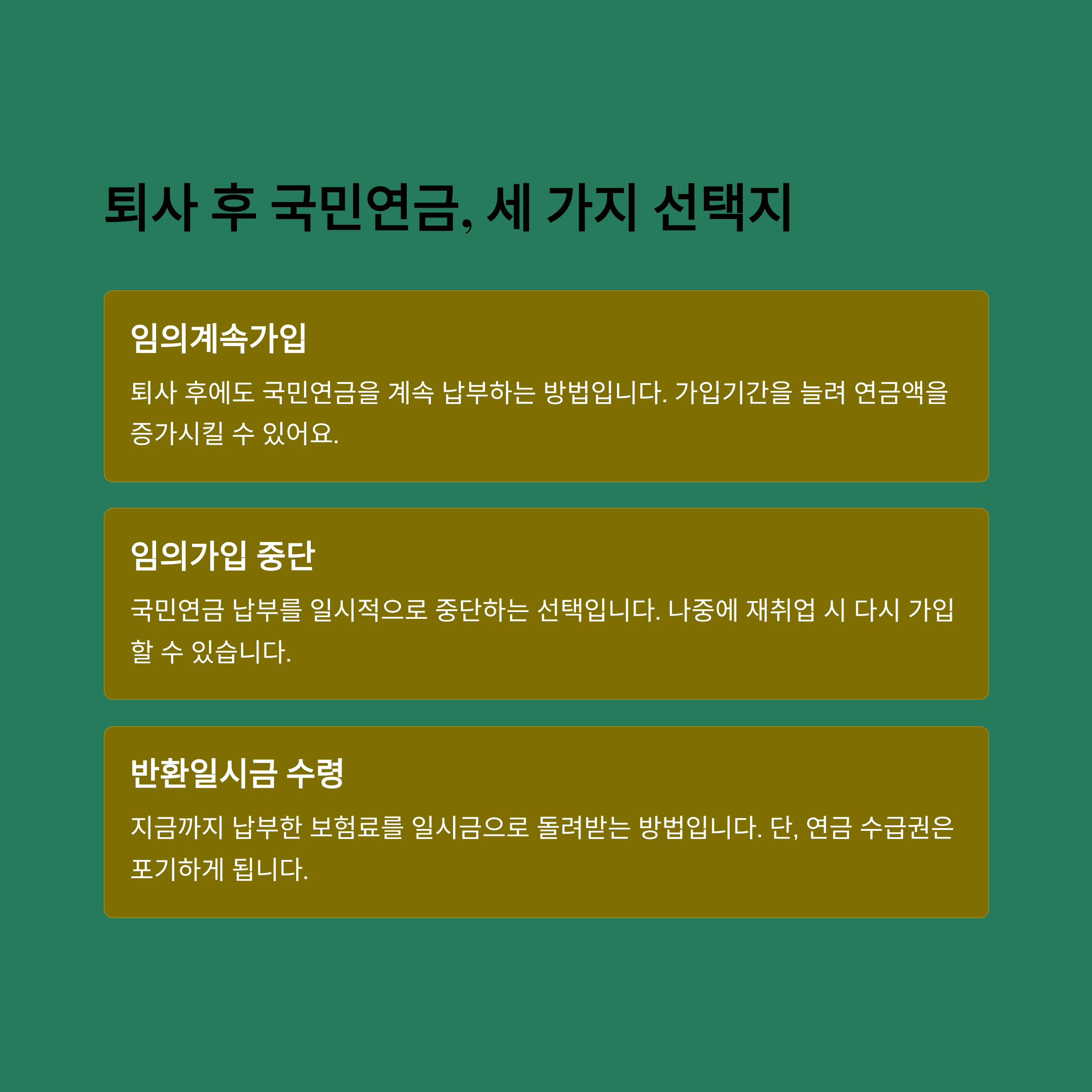 퇴사 후 지역가입자로 전환되는 것이 기본이지만, 개인의 상황에 따라 국민연금을 어떻게 처리할지 선택할 수 있는 세 가지 주요 옵션이 있습니다.