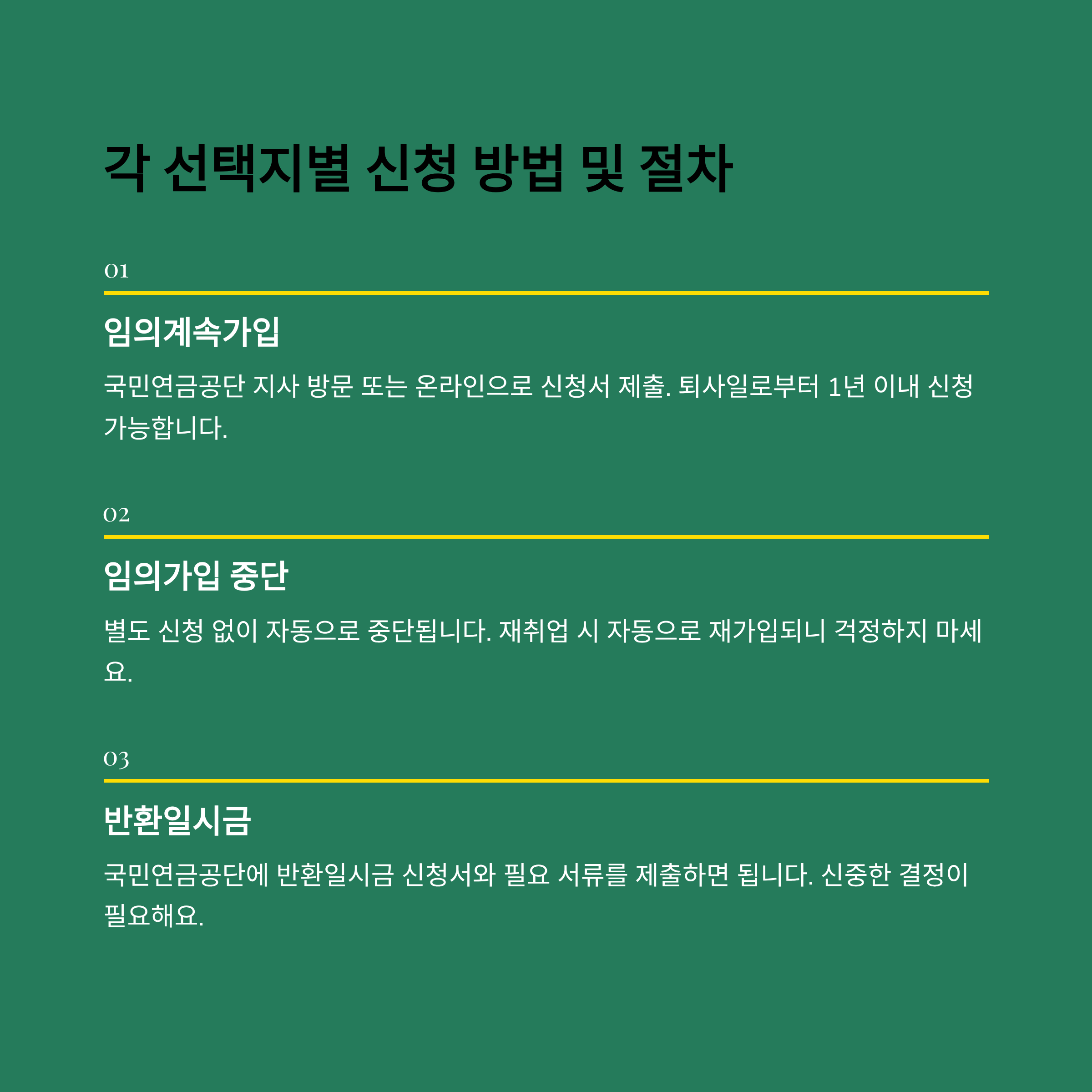 퇴사 후 국민연금 관련 선택을 했다면, 다음의 방법으로 신청 및 절차를 진행할 수 있습니다. 대부분 국민연금공단 홈페이지 또는 방문을 통해 처리됩니다.