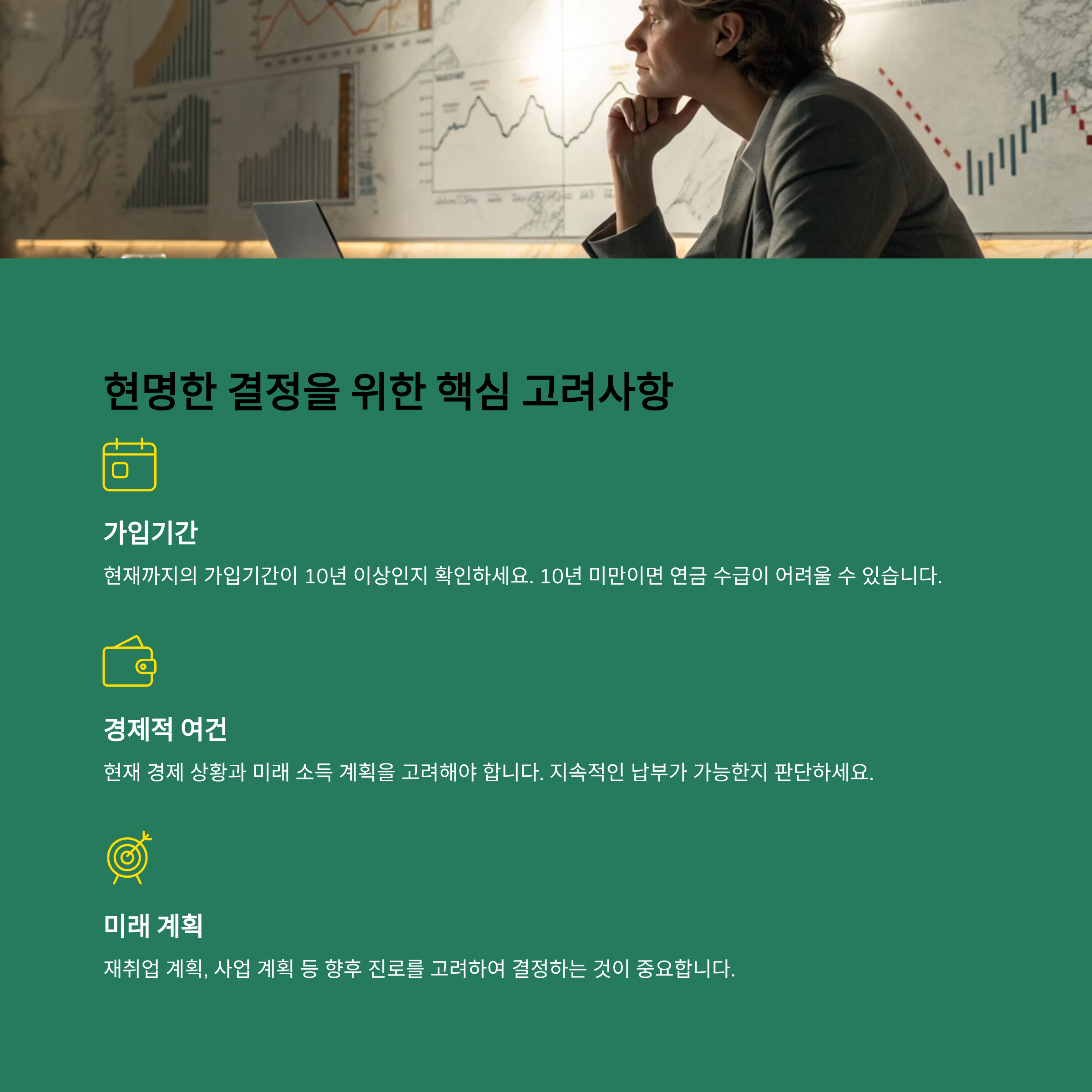 - 다른 재정 계획: 당장 필요한 자금이 있는지(반환일시금 고려), 다른 노후 대비 자산(개인연금, 퇴직연금 등)은 충분한지 등을 종합적으로 고려합니다.