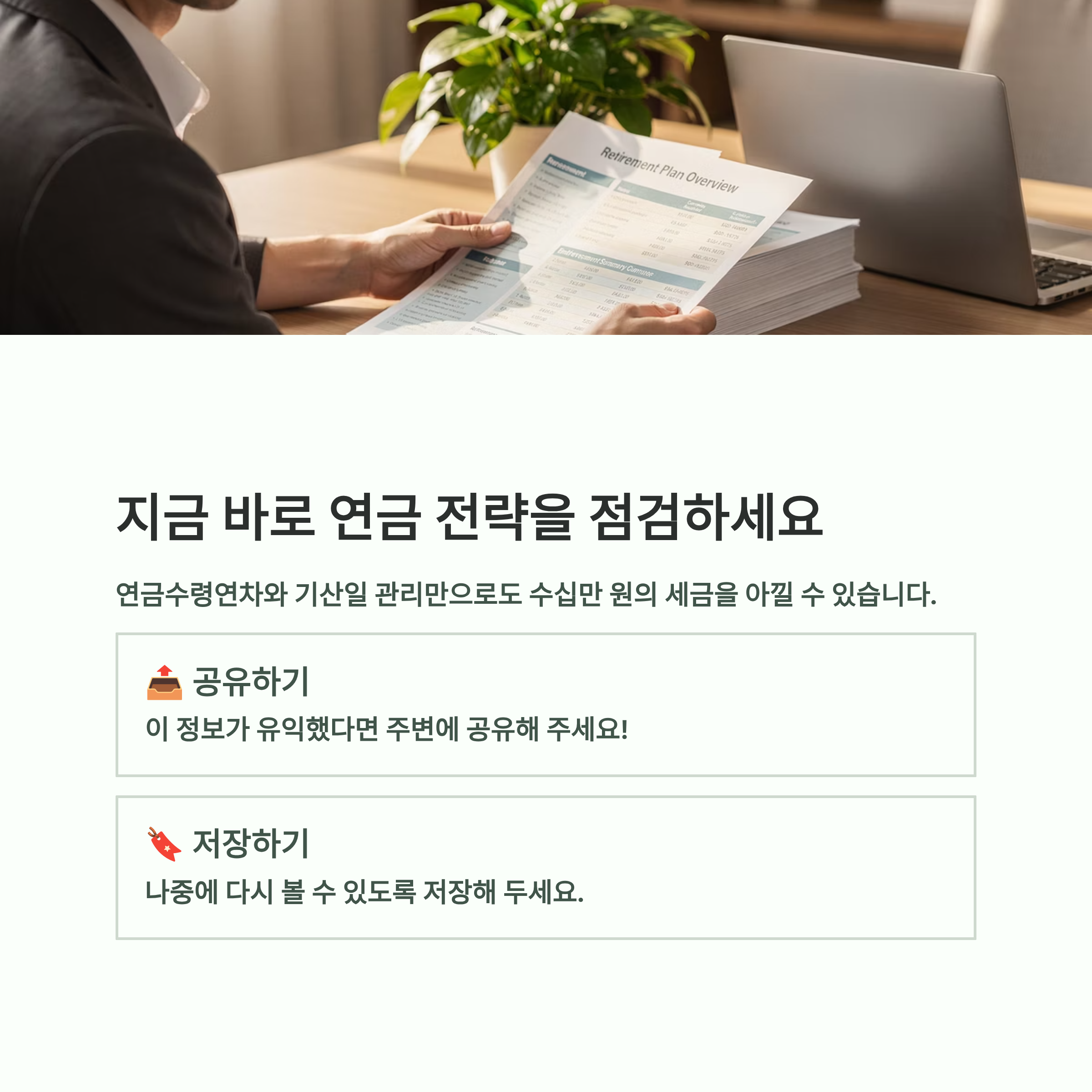- 소액 인출 전략: 만 55세가 되자마자 필요 없더라도 최소 금액을 수령하여 연차를 개시합니다.