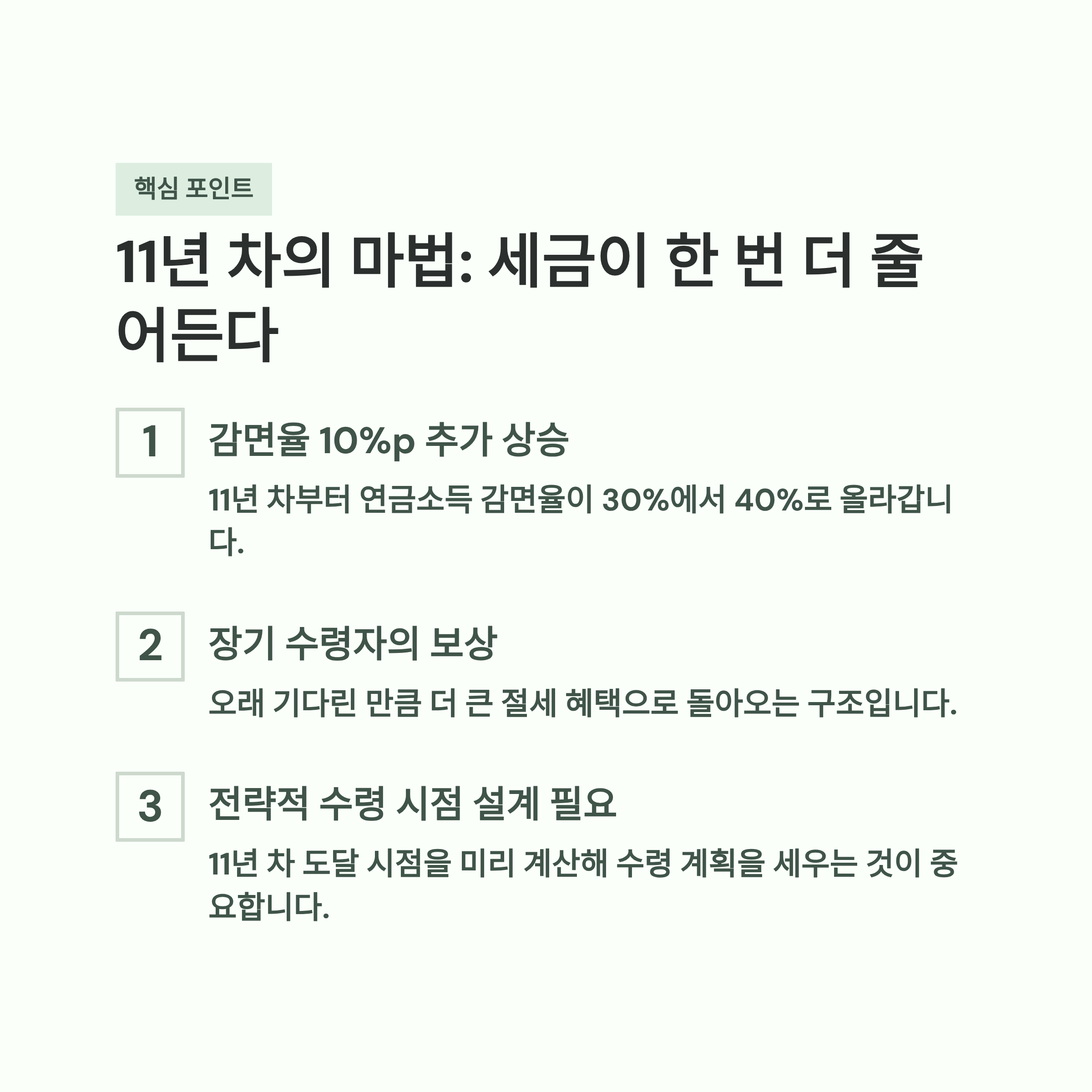 👉 즉, 오래 나누어 받을수록 국가에서 주는 보너스(추가 절세)가 커지는 구조입니다.