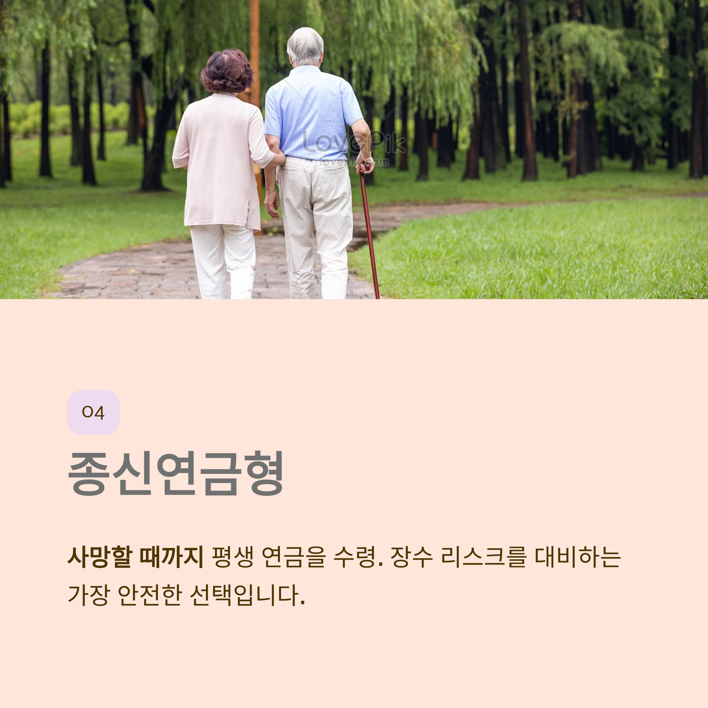 - 장점: 아무리 오래 살아도 연금이 끊기지 않아 심리적 안정감이 매우 높음