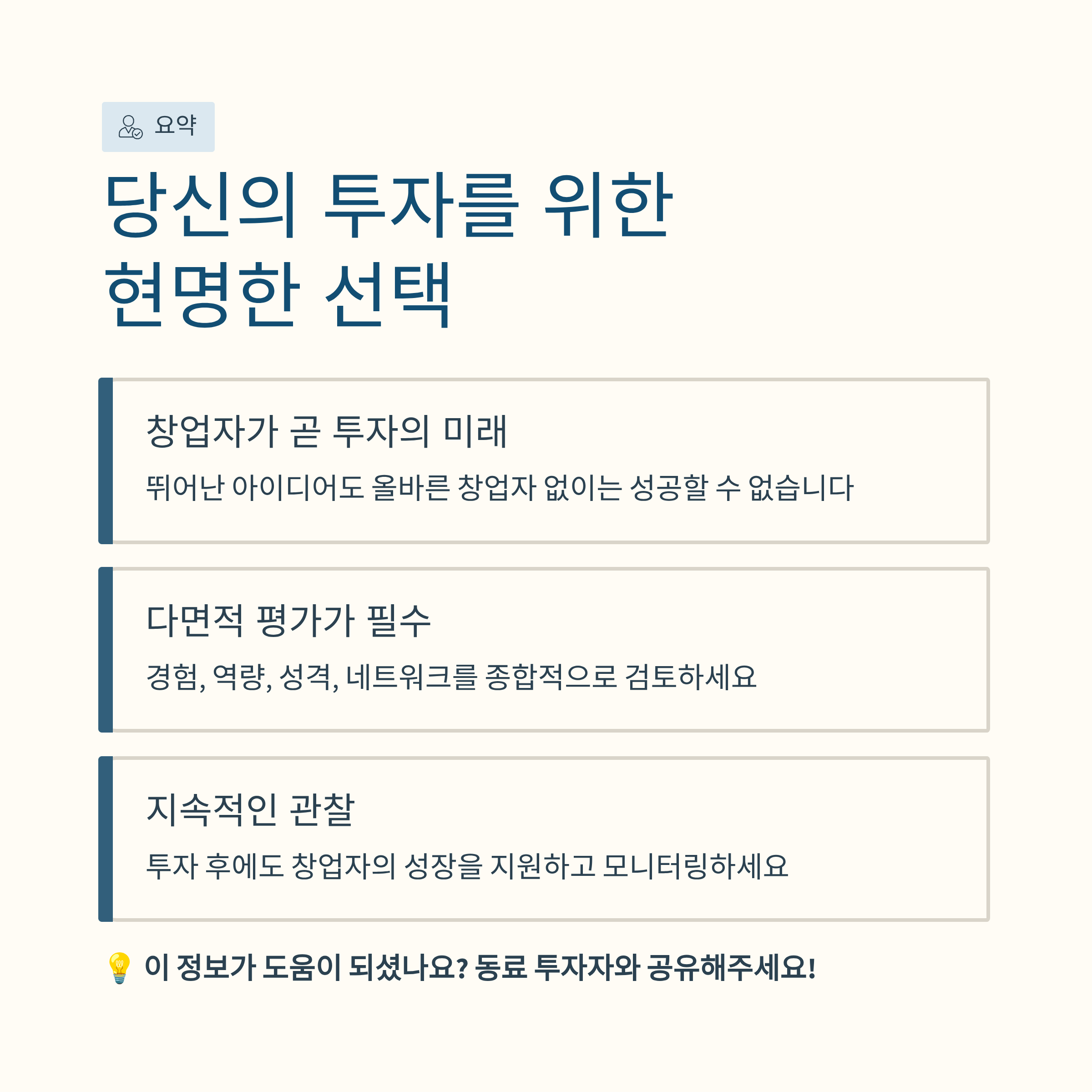 이 가이드에서 제시된 핵심 자질과 평가 전략을 바탕으로, 당신이 투자하려는 기업의 창업자를 면밀히 분석해보세요. 그의 스토리와 실행력을 확인하고, 팀 구성과 리더십을 평가하며, 평판 조회를 통해 숨겨진 잠재력까지 파악한다면, 당신의 투자는 더욱 현명하고 성공적인 결과를 가져올 것입니다. '사람'을 보고 투자하는 당신의 지혜로운 결정을 응원합니다!