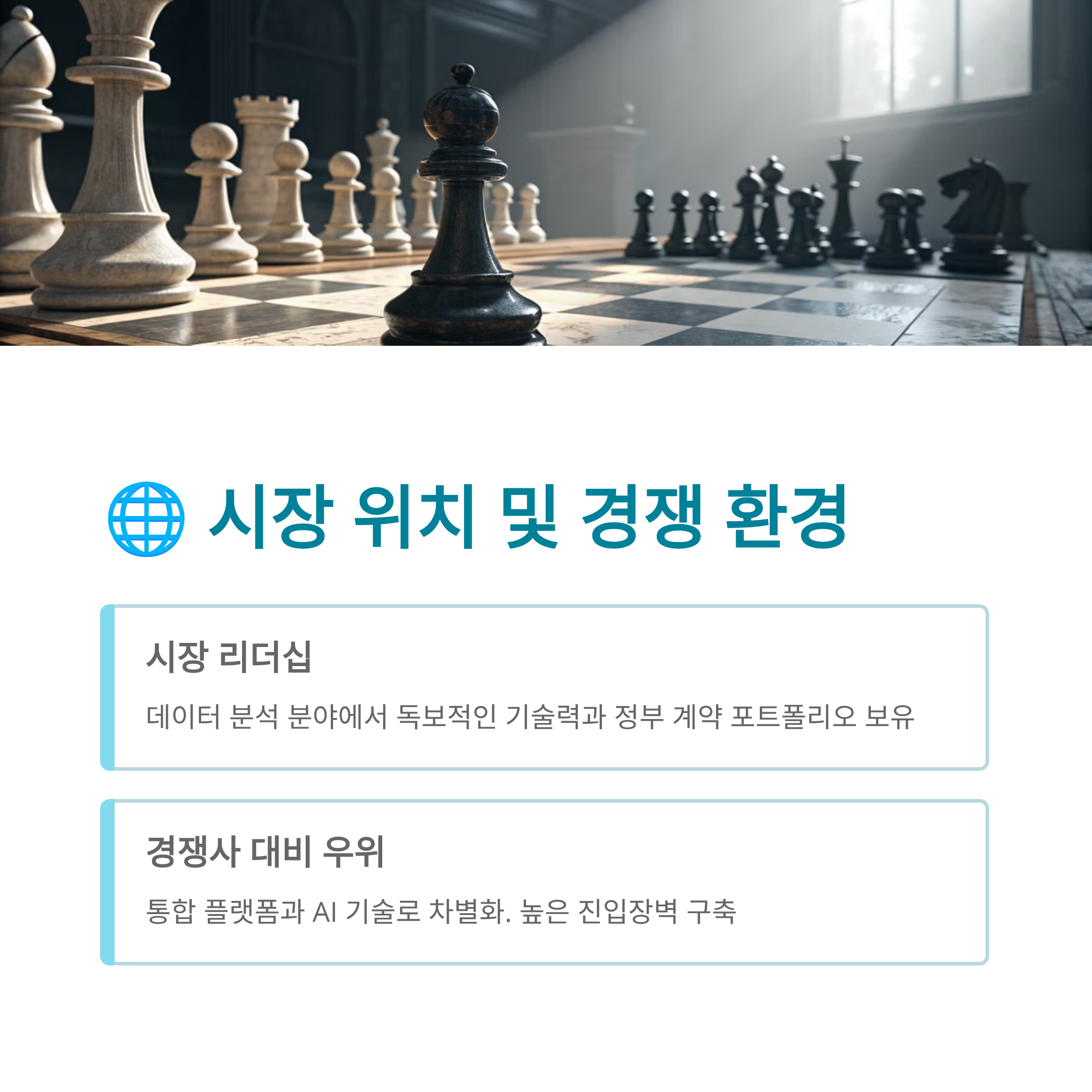 - 주요 경쟁사: IBM, Microsoft, Oracle과 같은 대형 IT 기업들이 유사한 데이터 분석 및 AI 솔루션을 제공하며 경쟁하고 있습니다. AWS, 구글 클라우드, 마이크로소프트 애저 등 빅테크 기업들도 이 분야에서 강력한 입지를 보유하고 있습니다. 신생 AI 스타트업들과도 경쟁합니다.