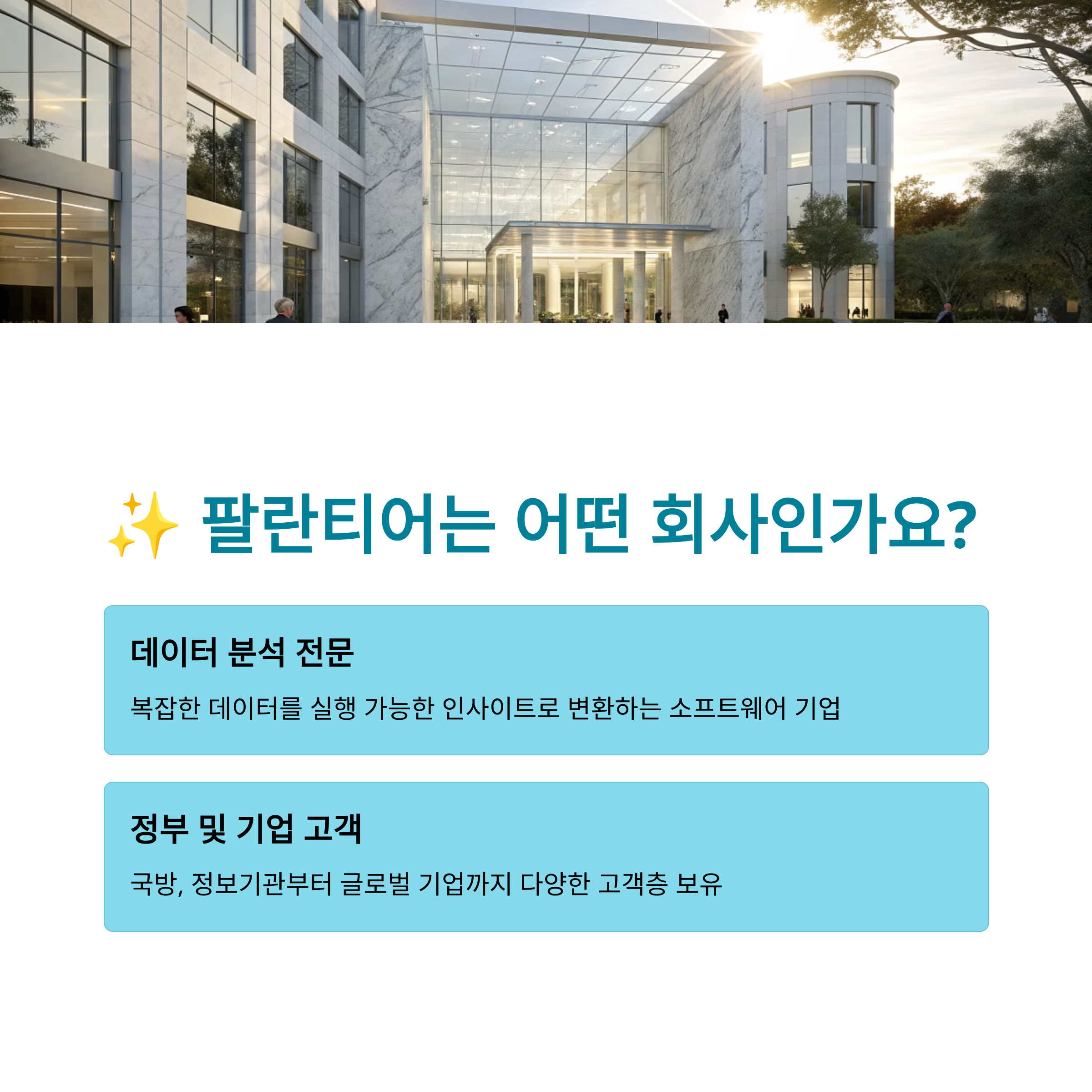 🔒 본 콘텐츠는 팔란티어 테크놀로지스에 대한 일반적인 정보 제공을 목적으로 작성되었습니다. 모든 정보는 참고용이며, 투자 권유가 아닙니다. 주식 투자를 포함한 모든 투자는 원금 손실의 위험을 수반하므로, 투자 결정은 투자자 본인의 판단과 책임 하에 이루어져야 합니다. 반드시 관련 전문가와 상담 후 신중하게 결정하시기 바랍니다.