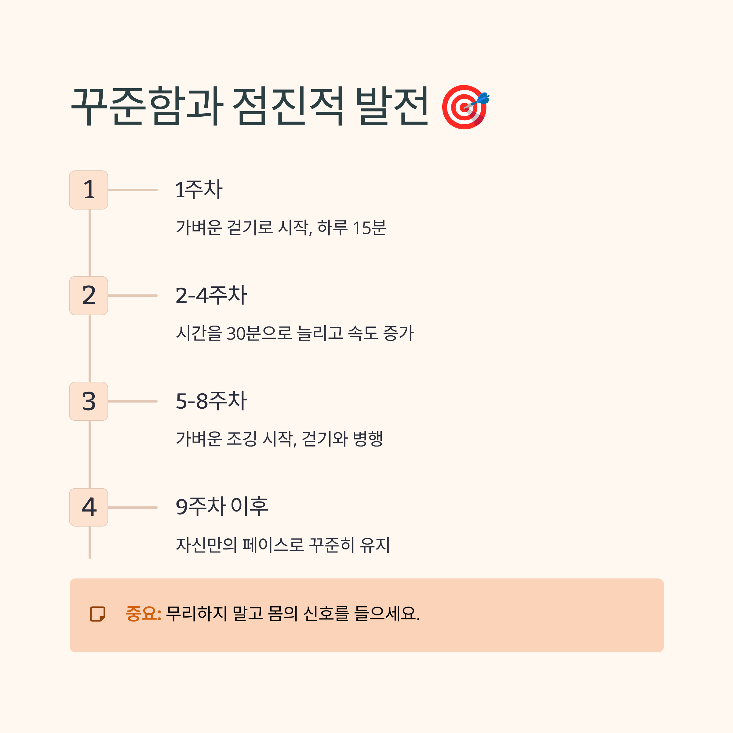 | 점진적 증가 | 시간/강도 조금씩 늘리기 | 부상 예방, 지속적인 발전 |