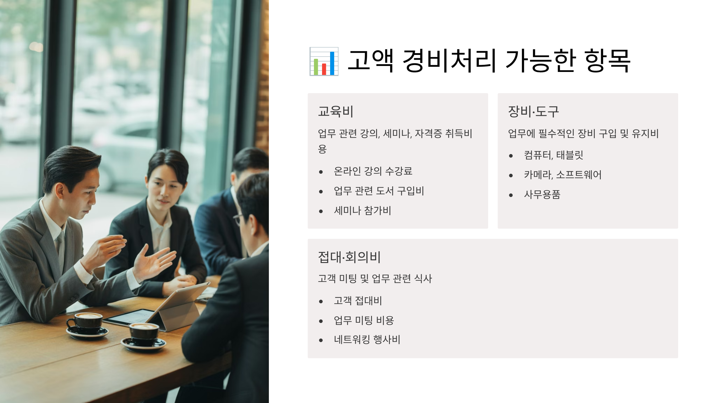 아래는 일반적으로 고액이라도 경비로 인정받을 수 있는 항목들이에요. 단, 항상 '명확한 증빙'이 있어야 한다는 것, 잊지 마세요!