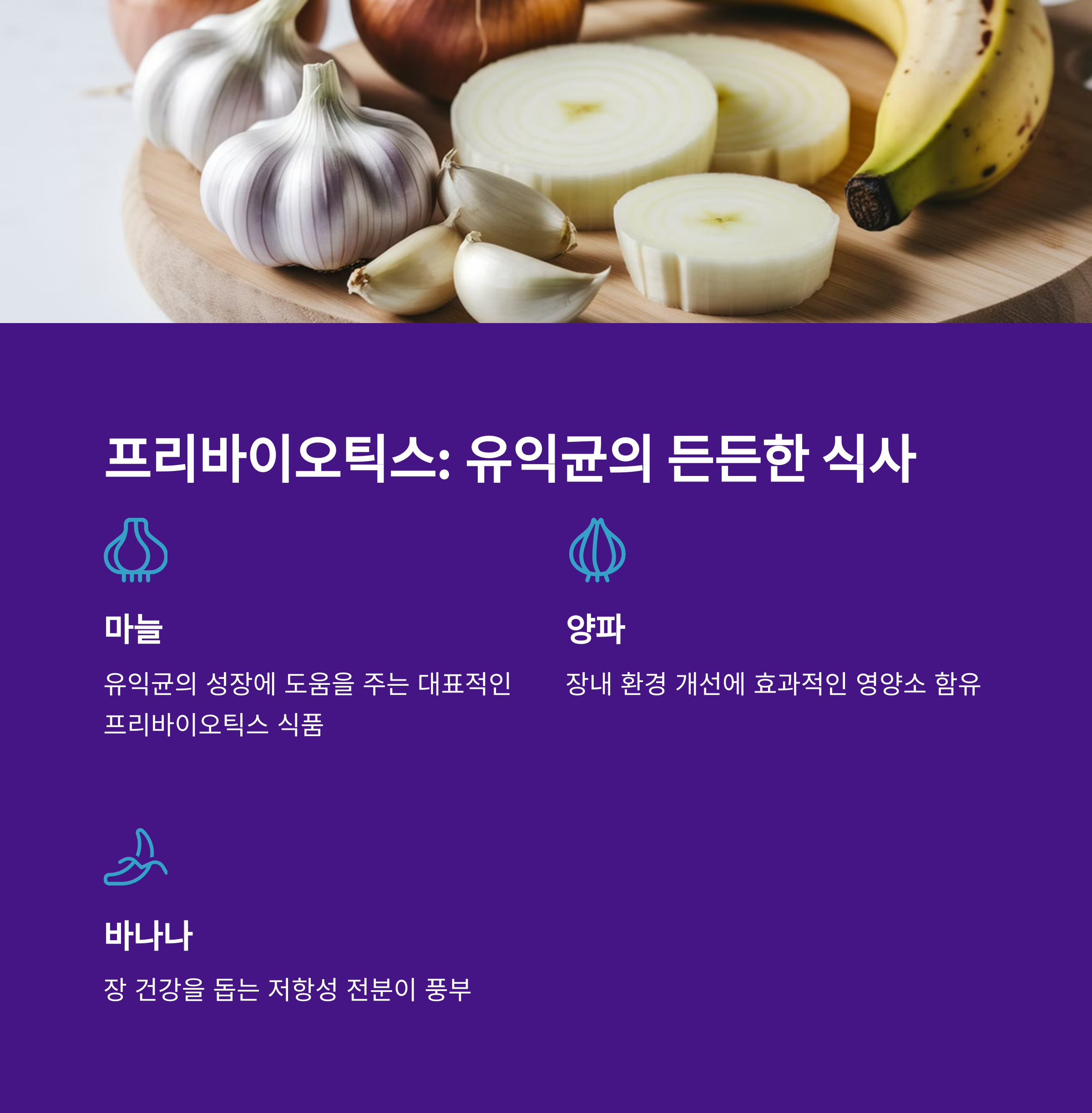 | 마늘, 양파, 바나나 등 | 요거트, 김치, 된장 등 | 유산균과 섬유소 함께 섭취 |