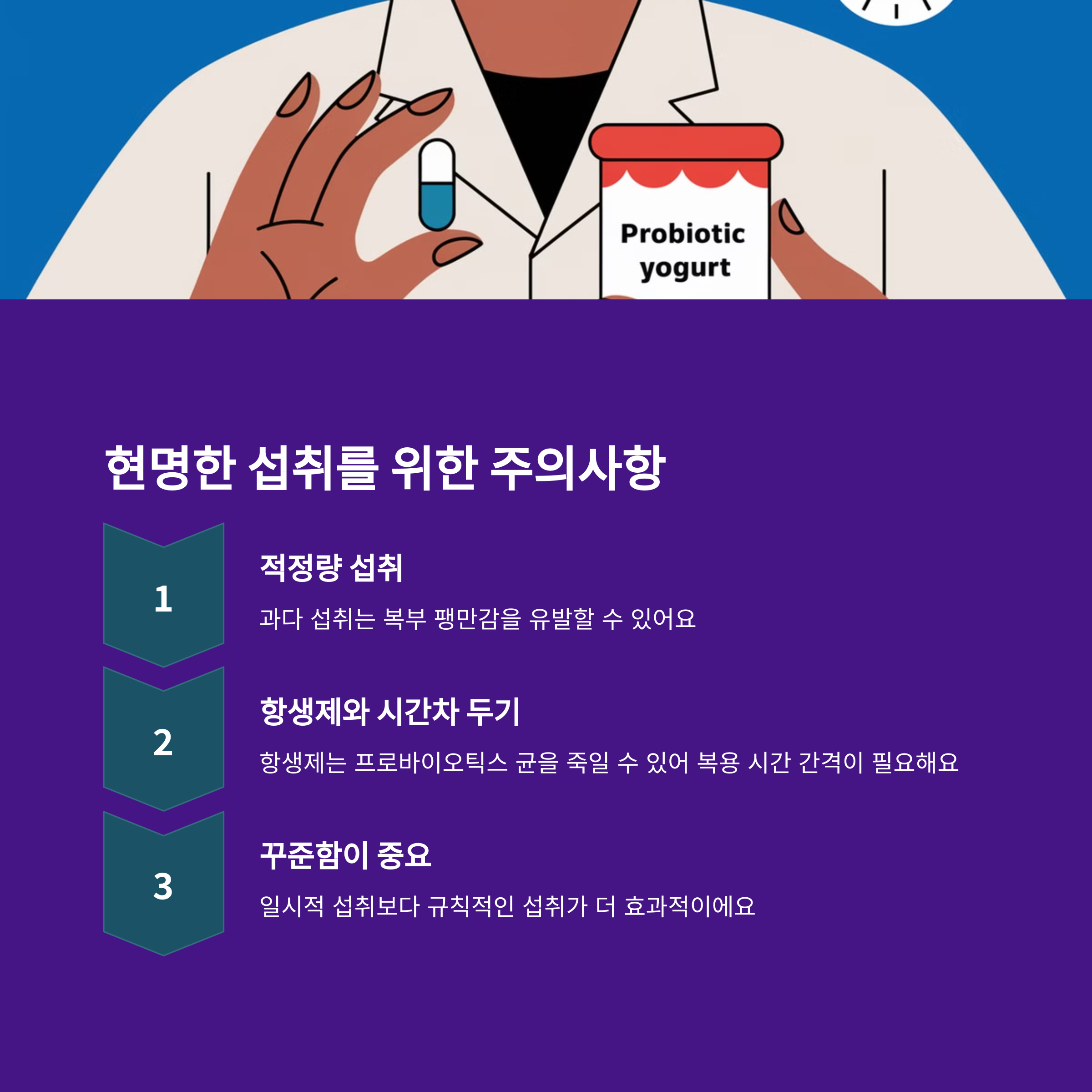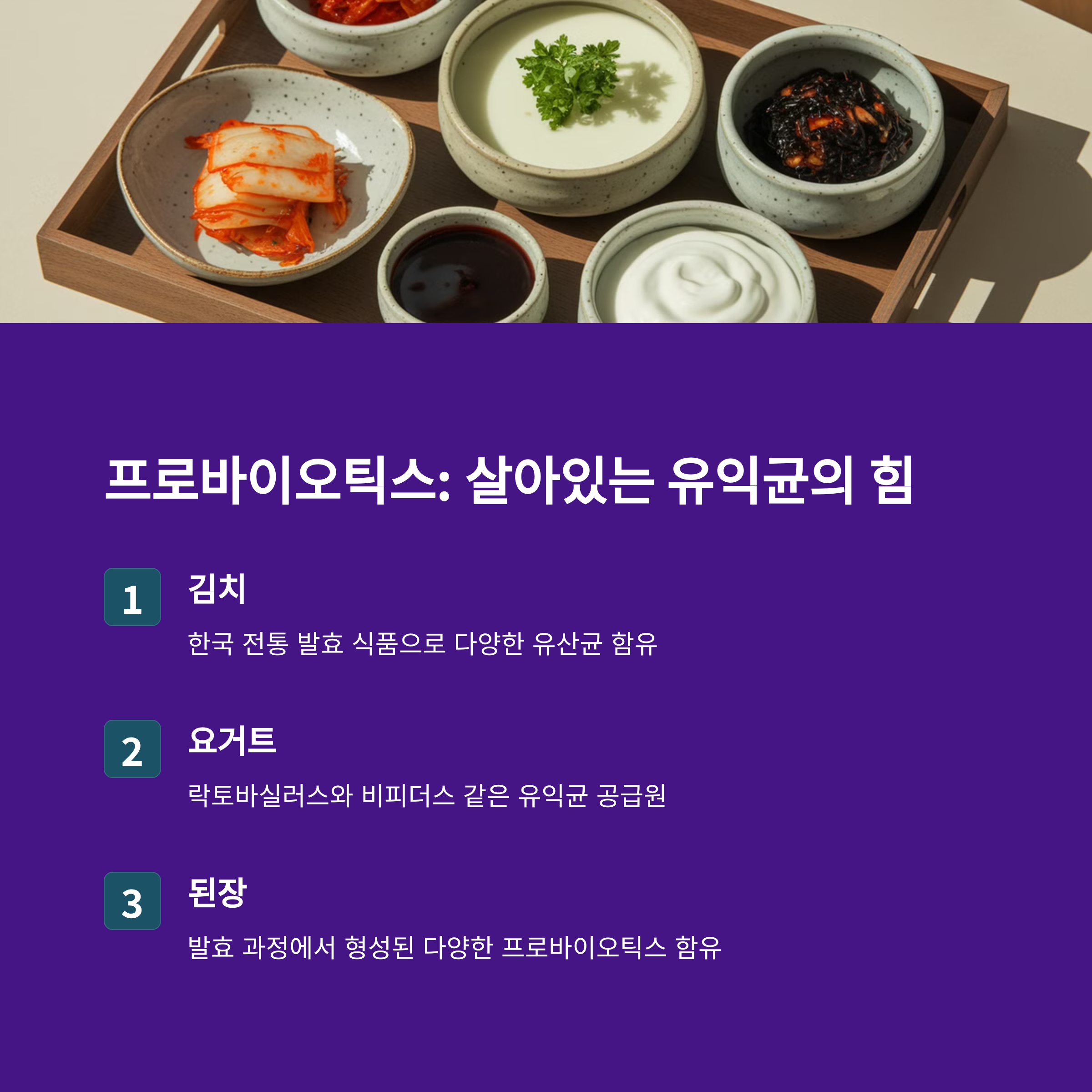 | 유익균의 먹이가 되는 성분 | 직접 유익균을 공급하는 생균 | 균형 잡힌 식단과 꾸준한 섭취 |