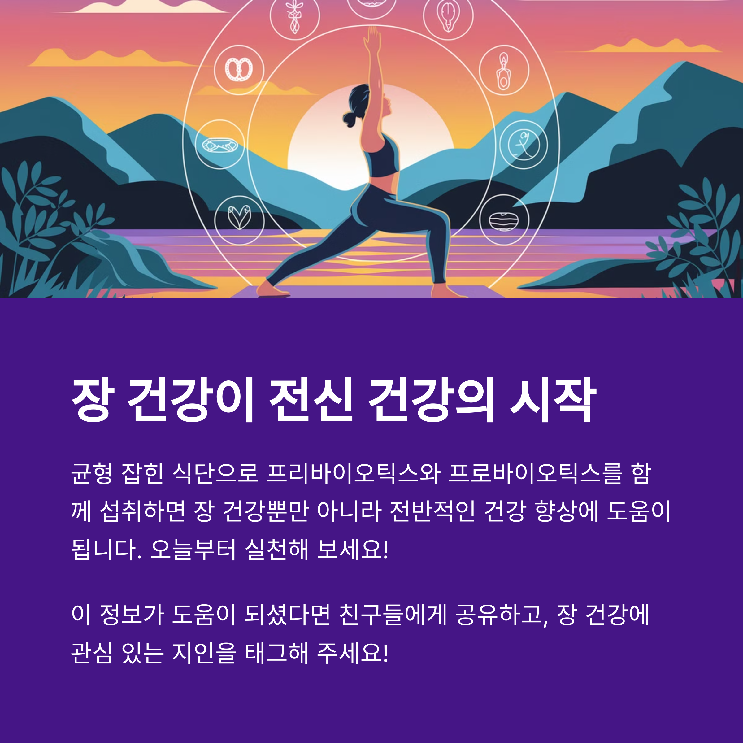 프리바이오틱스와 프로바이오틱스는 장 건강을 유지하는 데 중요한 역할을 합니다. 균형 잡힌 섭취를 통해 장내 유익균을 활성화하고 면역력을 높이는 것이 좋습니다. 오늘부터 작은 실천으로 건강한 장을 만들어 보세요!