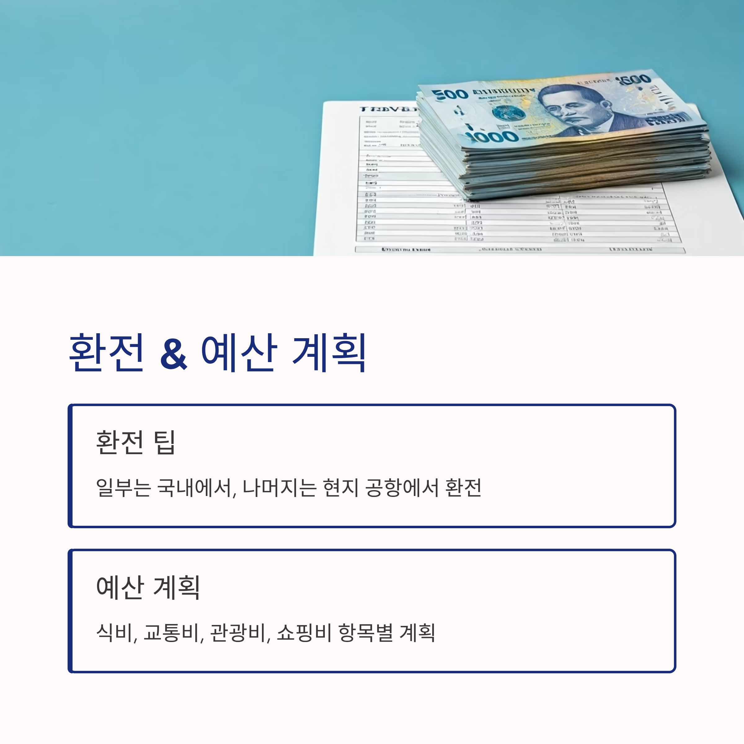 | 예산 | 항목별/1일 예산 설정, 비상금 준비, 해외 사용 카드 지참 |