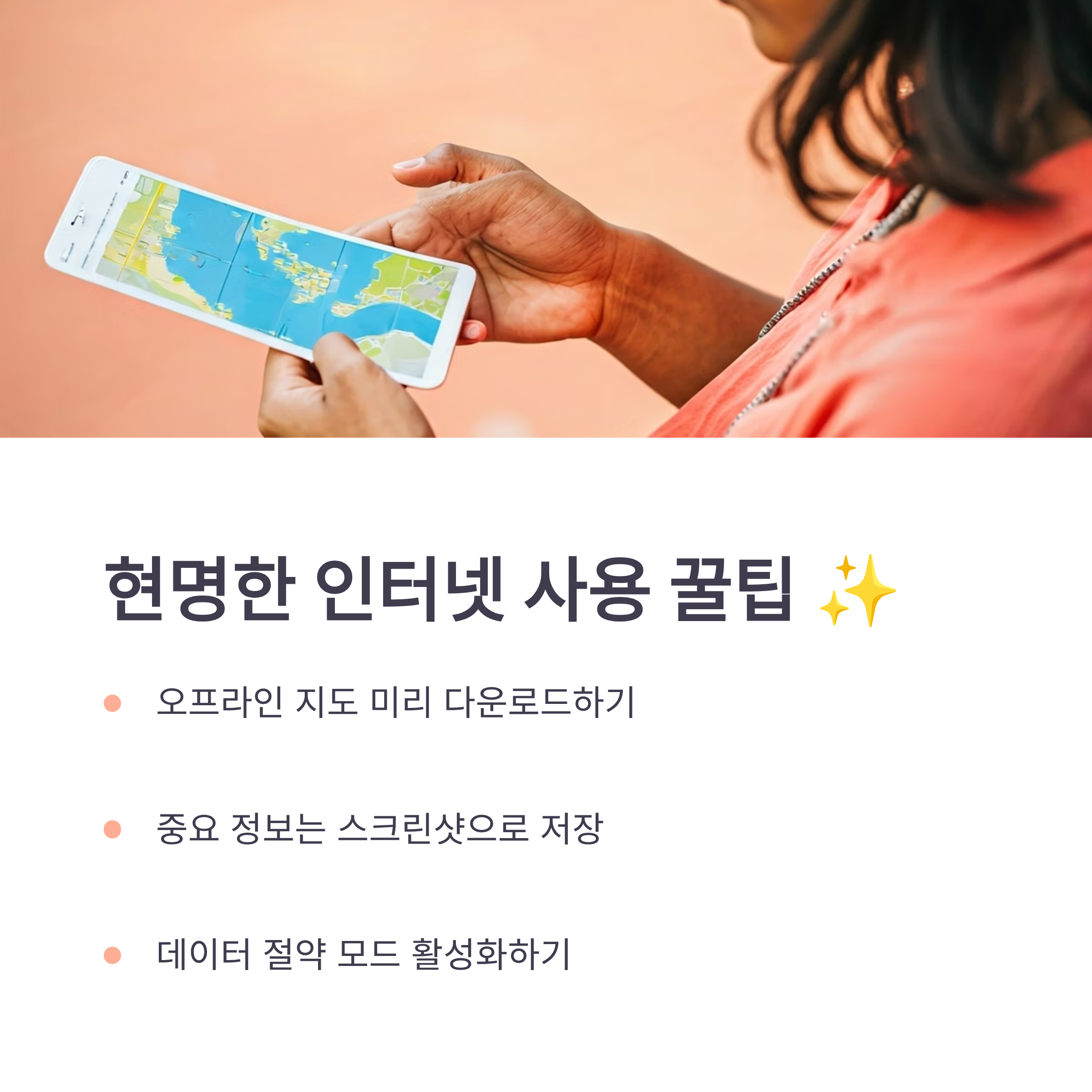 - 호텔, 리조트, 주요 카페나 쇼핑몰 등에는 무료 와이파이가 제공되는 경우가 많습니다. 이를 적절히 활용하면 데이터 사용량을 줄일 수 있습니다.