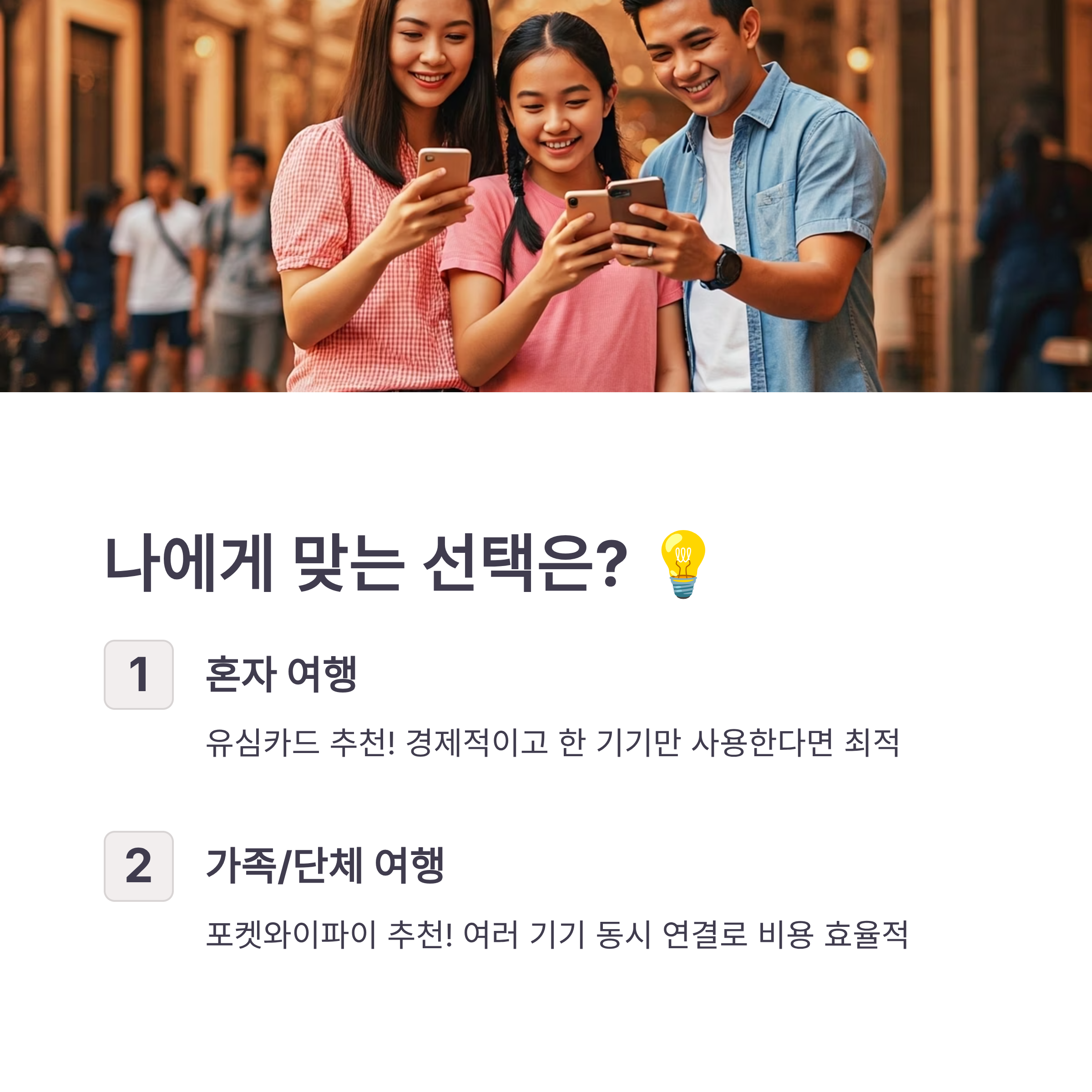 - 단체 여행객 (3인 이상 가족/친구): 1개의 기기로 여러 명이 나눠 쓰면 오히려 유심 개별 구매보다 저렴하고 편리할 수 있습니다.