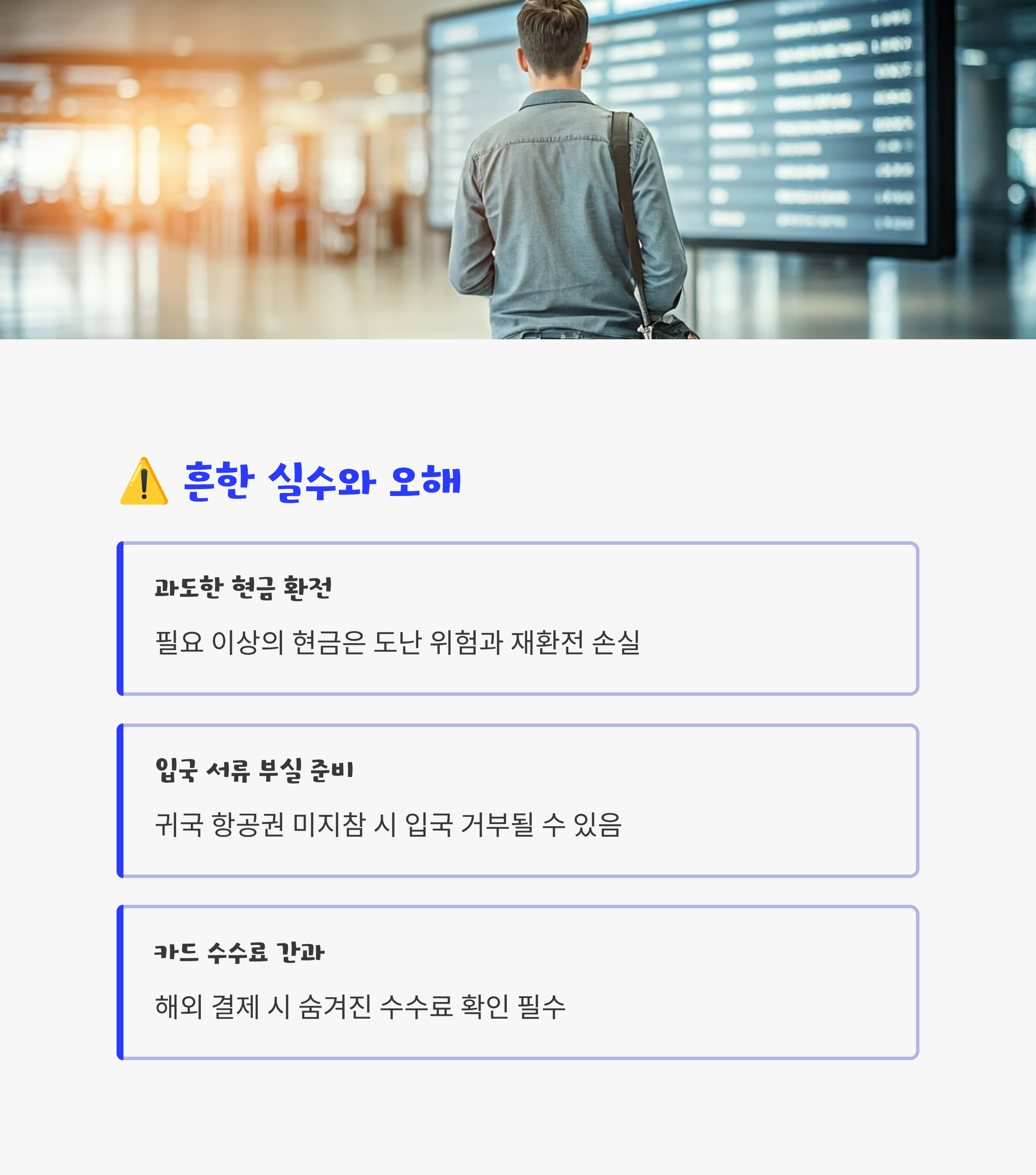 둘째, '시간과 비용의 효율성'이에요. 입국 심사에서 서류 미비 등으로 지연되면 여행 시간을 낭비하게 됩니다. 환전 역시 잘못된 방법으로 진행하면 수수료를 불필요하게 많이 지불하여 여행 경비 손실로 이어질 수 있어요.
