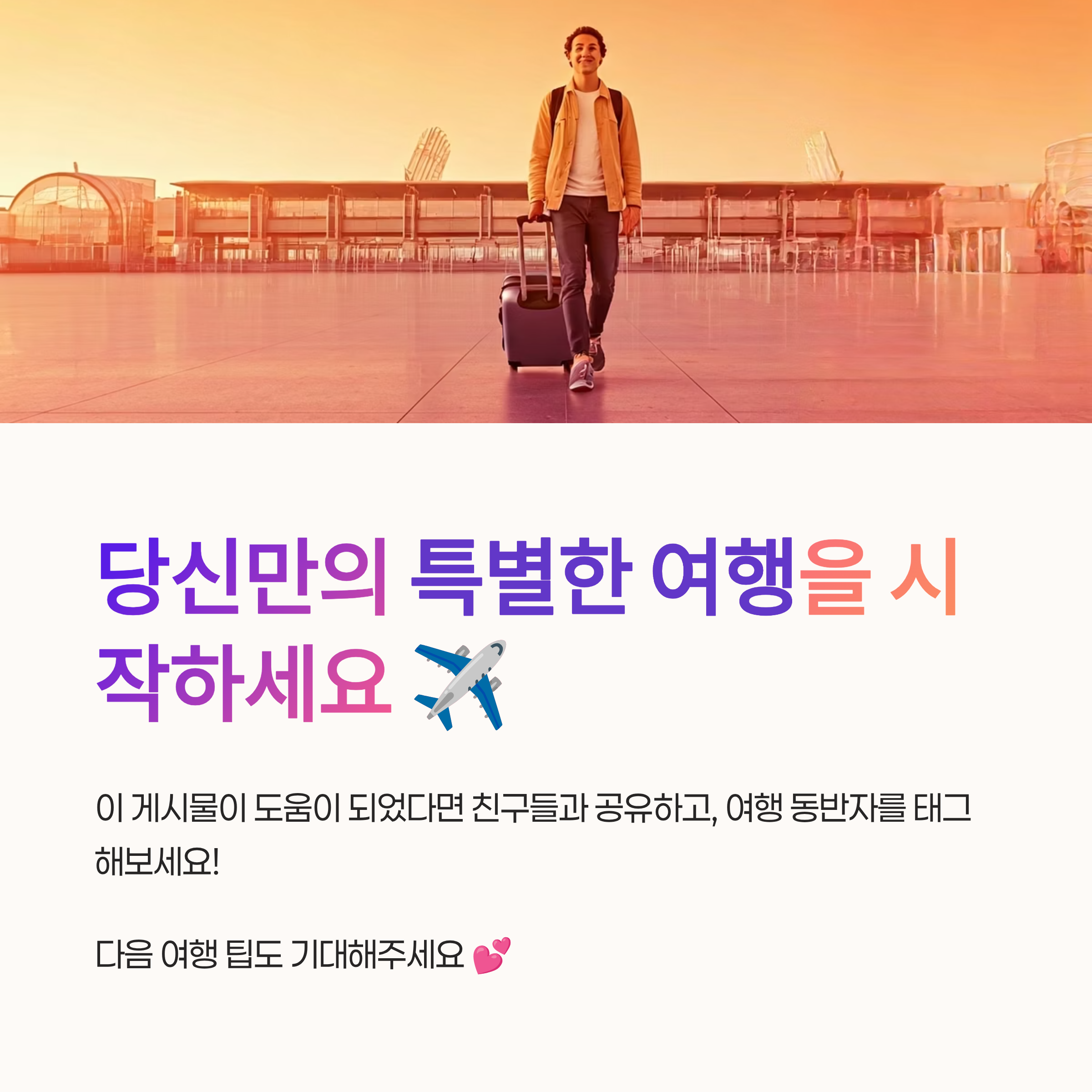 - 모든 것을 완벽하게 계획하려 하지 마세요. 여행은 예상치 못한 변수의 연속입니다. 때로는 여백을 두는 것이 더 큰 만족을 가져다줍니다. 유연한 마음으로 예상치 못한 상황을 받아들일 준비를 하세요.