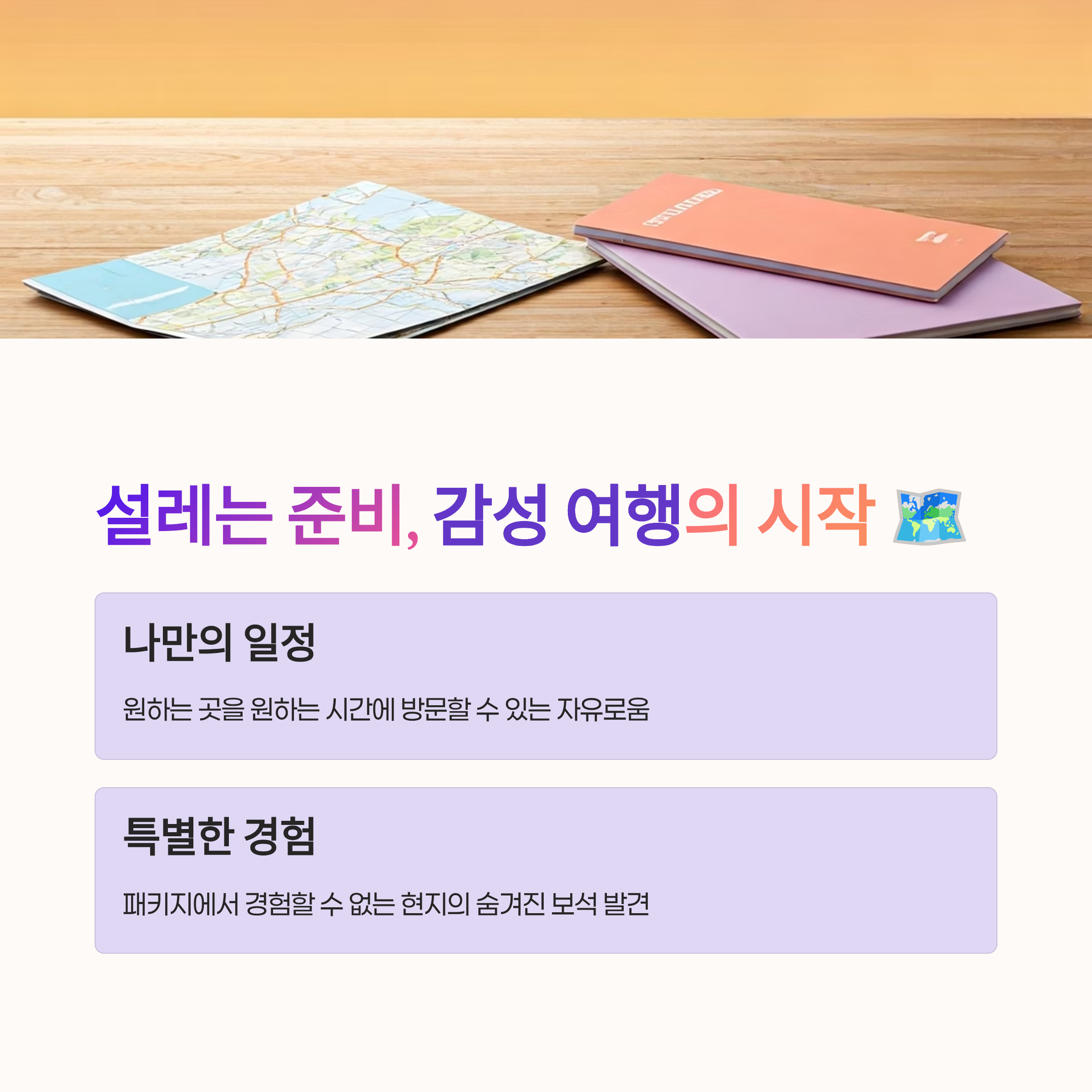 패키지여행과는 다른, 자유여행만이 줄 수 있는 특별한 가치가 있습니다. 계획과 실행의 모든 순간에서 얻을 수 있는 성취감과 새로운 발견의 기쁨은 자유여행의 진정한 매력입니다.