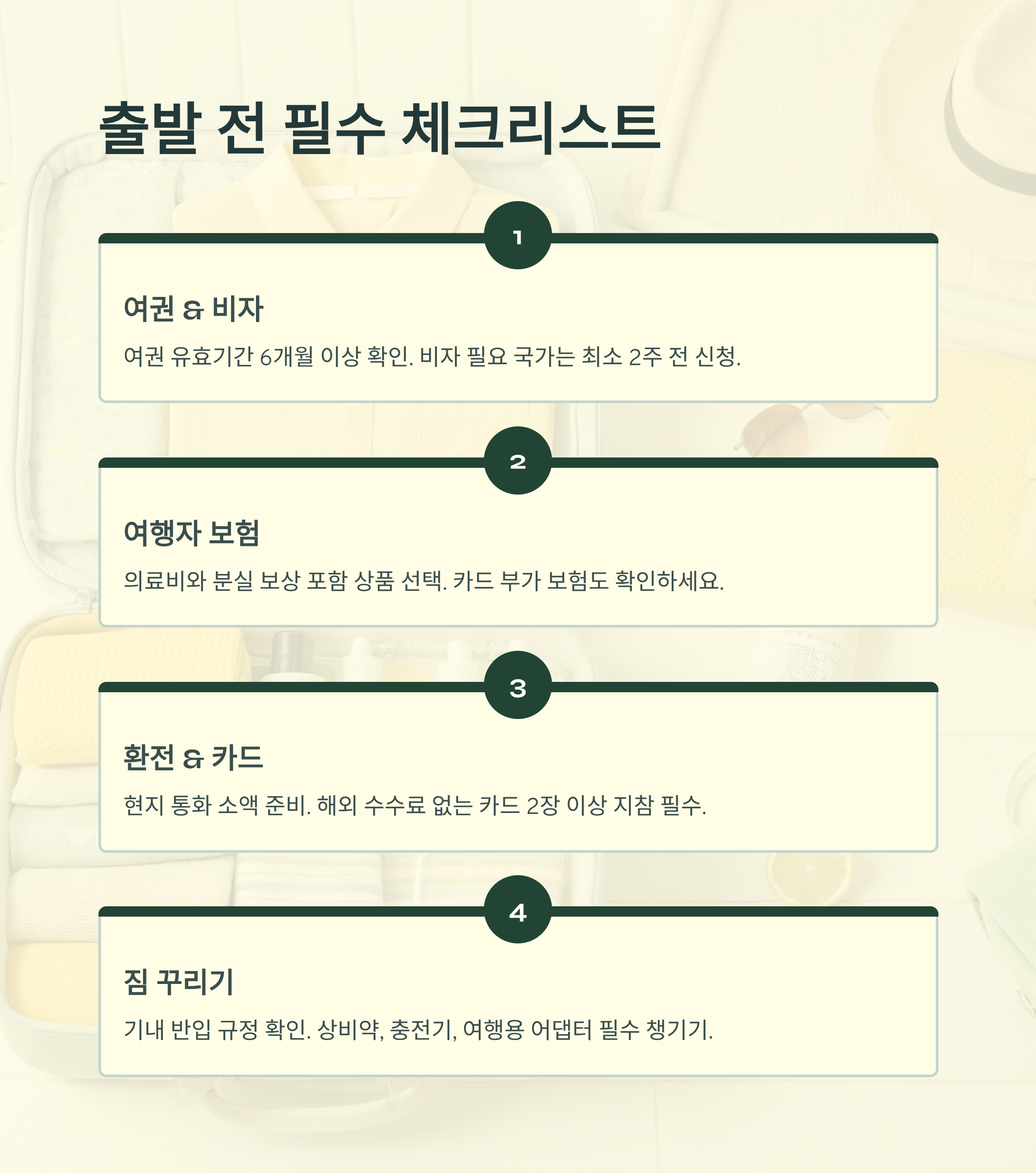 해외여행을 떠나기 전, 다음 체크리스트를 활용하여 빠뜨리는 것이 없는지 꼼꼼하게 확인하세요. 기본적인 준비는 더욱 즐겁고 안전한 여행을 만듭니다.