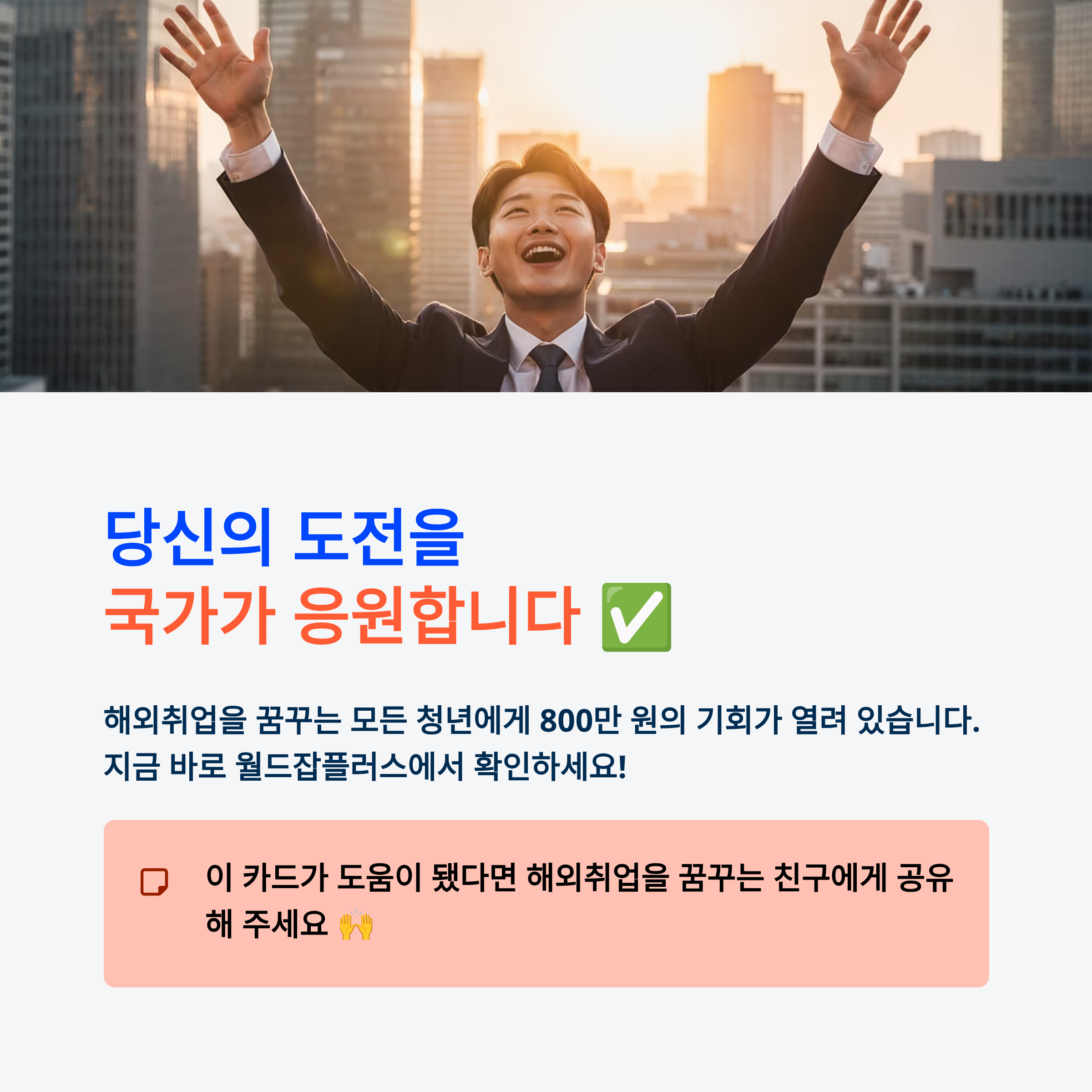 해외취업은 큰 용기가 필요한 도전입니다. 정부가 지급하는 800만 원의 지원금은 여러분이 낯선 타국에서 겪을 시행착오를 줄여주고, 더 높은 곳을 향해 나아갈 수 있는 발판이 되어줄 것입니다.