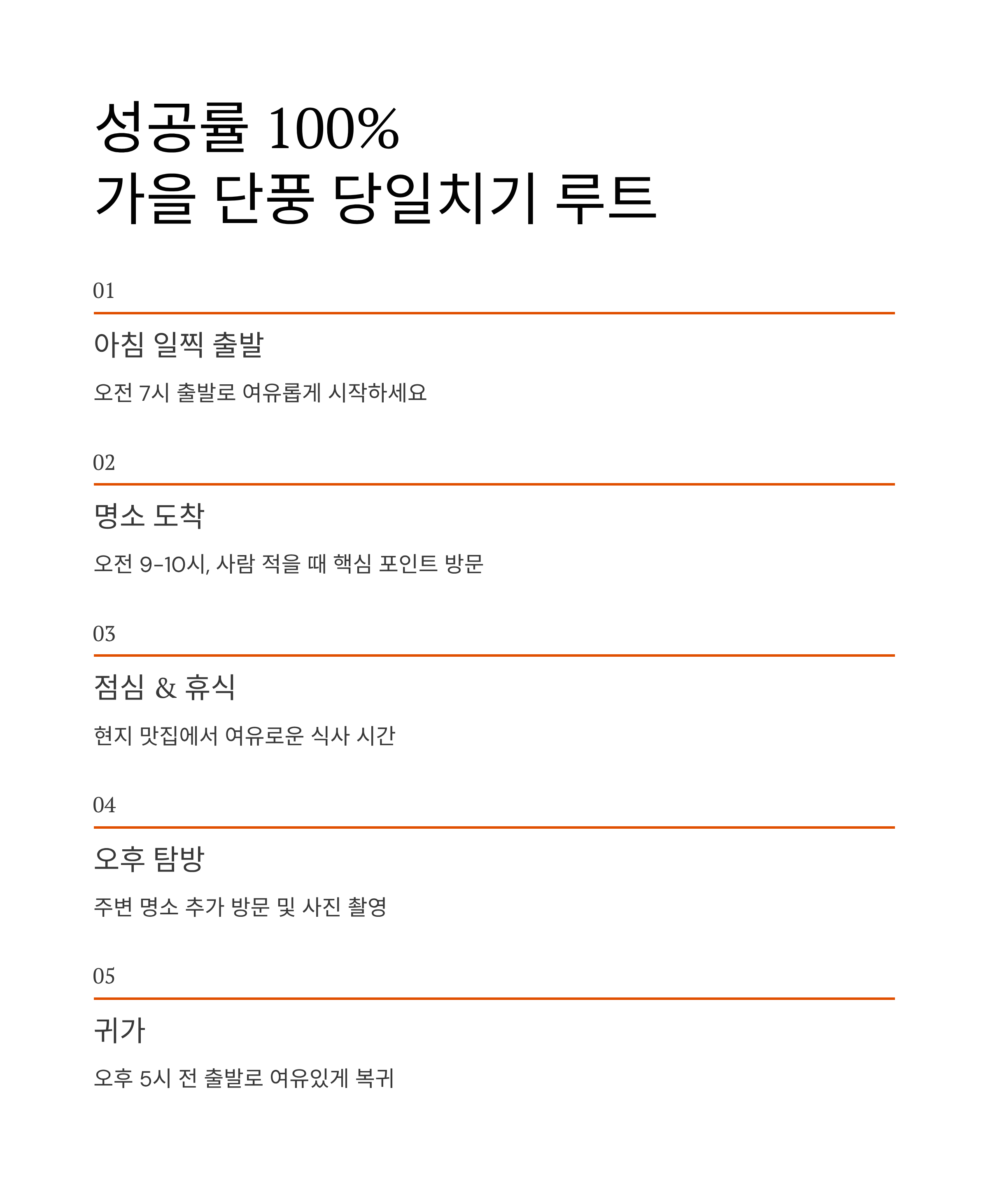 이 샘플 루트와 체크리스트는 당신의 단풍 여행을 위한 훌륭한 '지도'가 될 것입니다. 이 지도를 바탕으로 당신의 취향에 맞는 사진 포인트와 맛집을 더해 '나만의 보물 지도'를 완성해 보세요. 짧은 시간이라도 깊이 있는 추억을 만들 수 있을 겁니다.