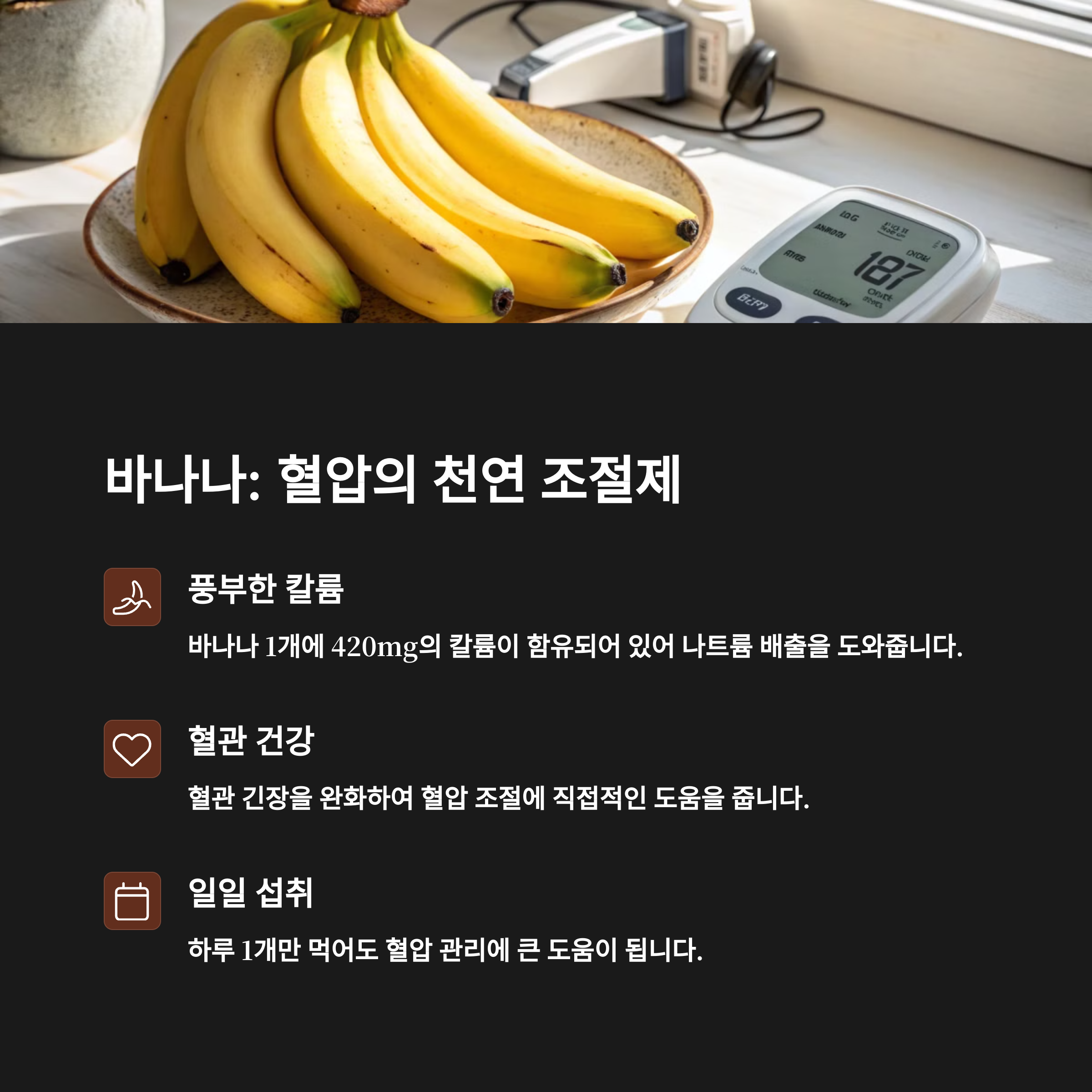 하루 1~2개 바나나로 간단히 혈압 관리에 도움이 되는 식단을 만들 수 있어요.