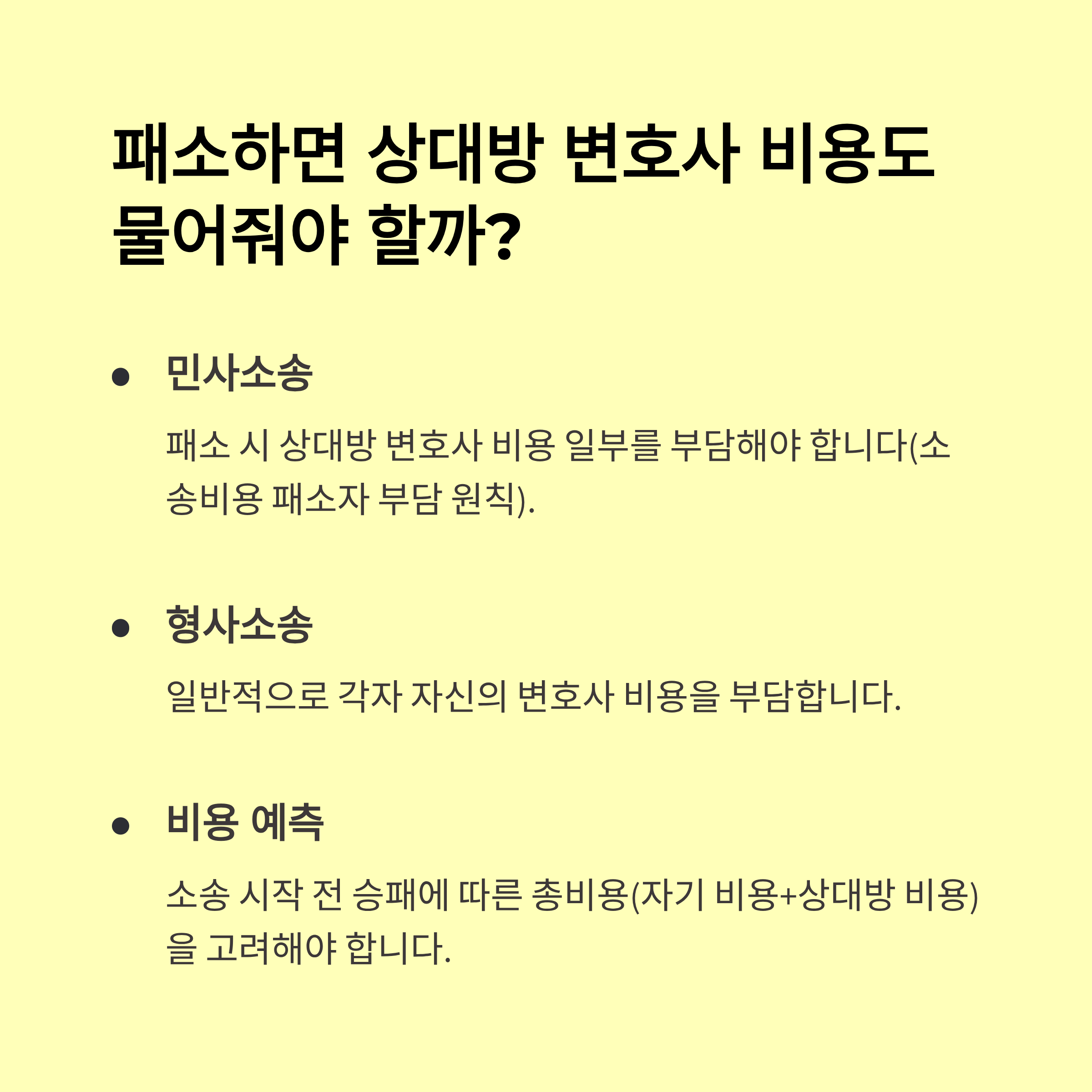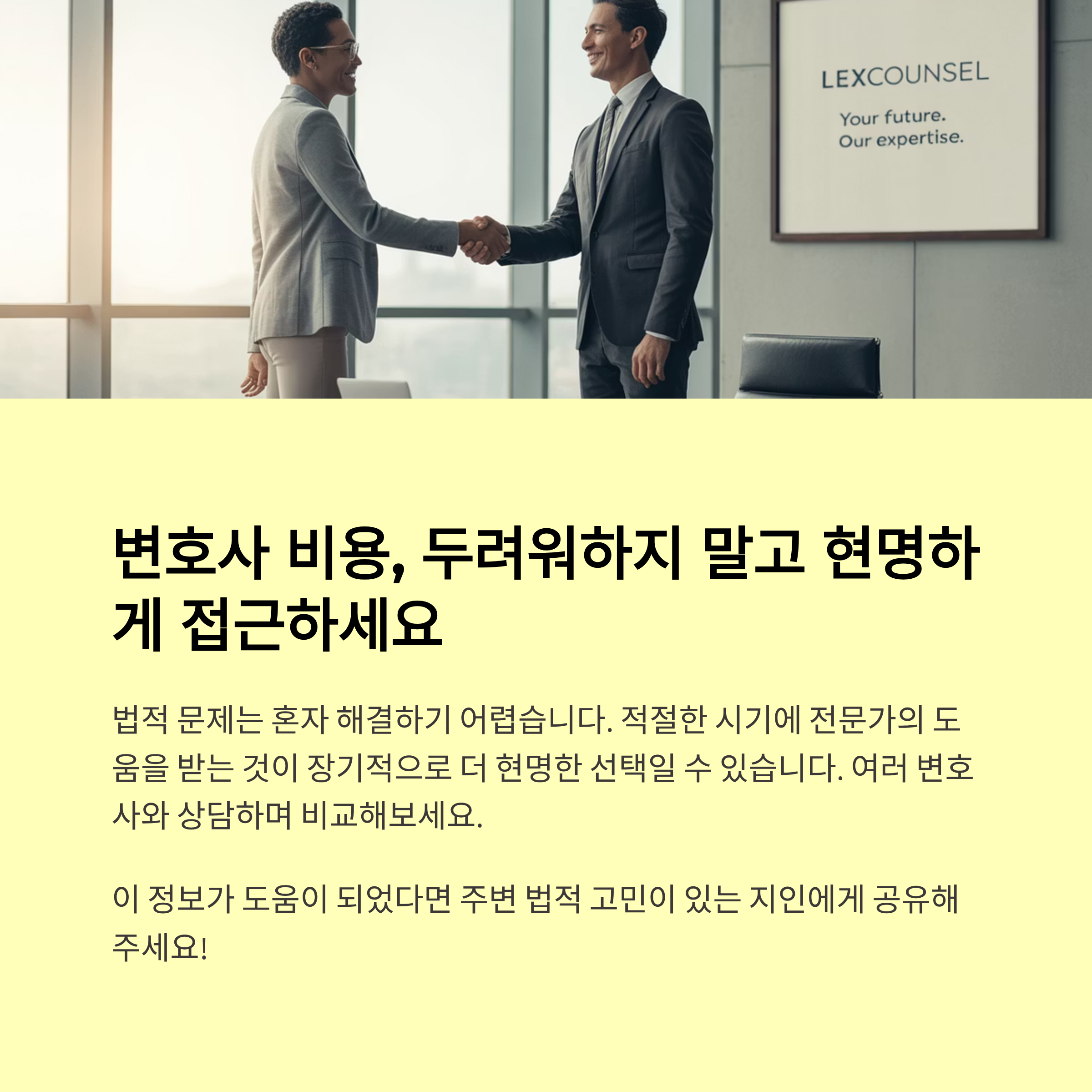 - 상담 시 착수금, 성공보수, 실비 등 모든 비용 항목에 대해 명확하게 설명해 달라고 요청하세요. 숨겨진 비용은 없는지 꼼꼼히 확인하고, 반드시 '서면 계약'을 통해 모든 내용을 확정해야 합니다.