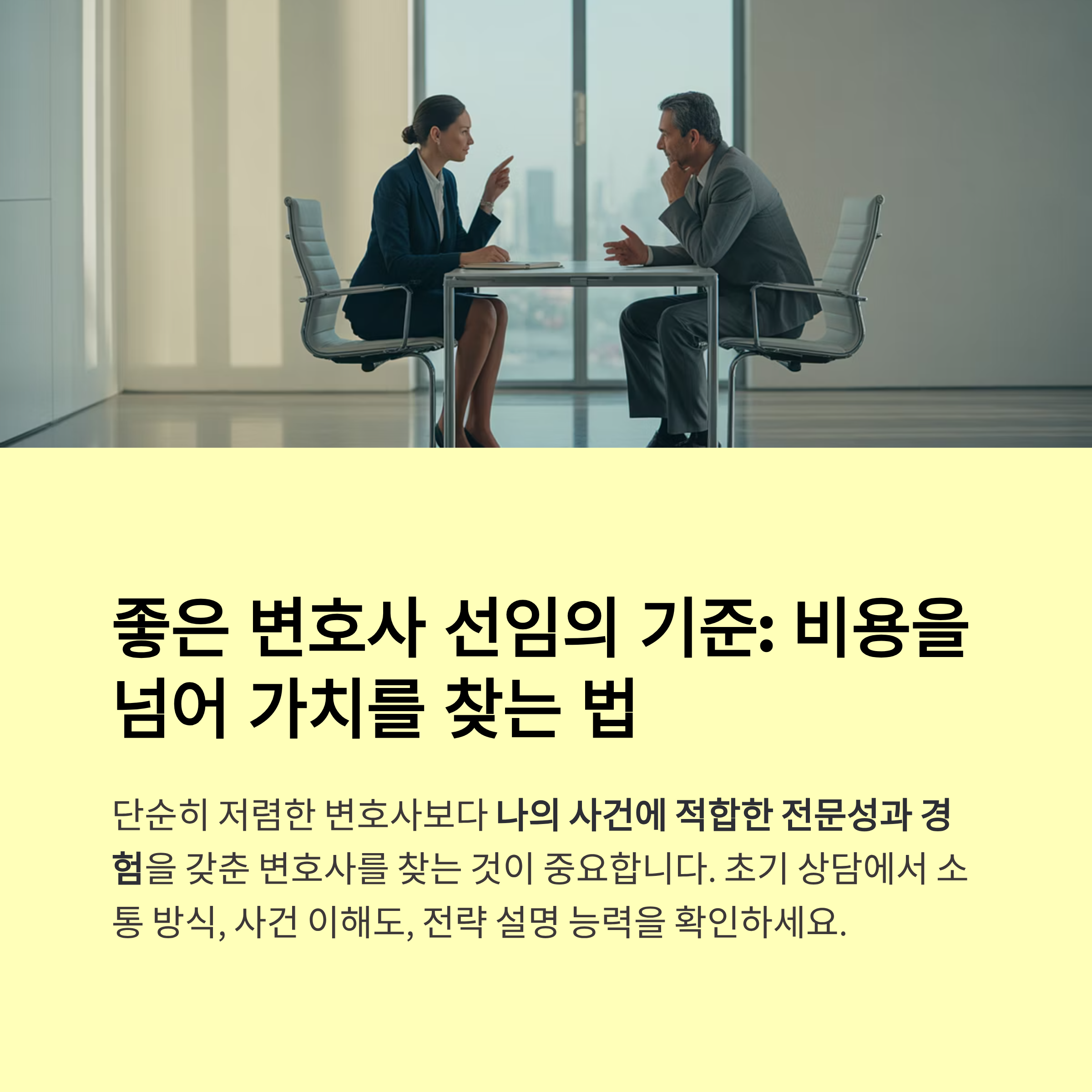 - 최소 2~3곳의 변호사 사무실을 방문하여 상담하고, 각 변호사의 사건 분석 능력, 예상 전략, 그리고 비용을 비교해 보세요. 비용만 보고 선택하기보다는 변호사와의 '소통'과 '신뢰'가 중요합니다.