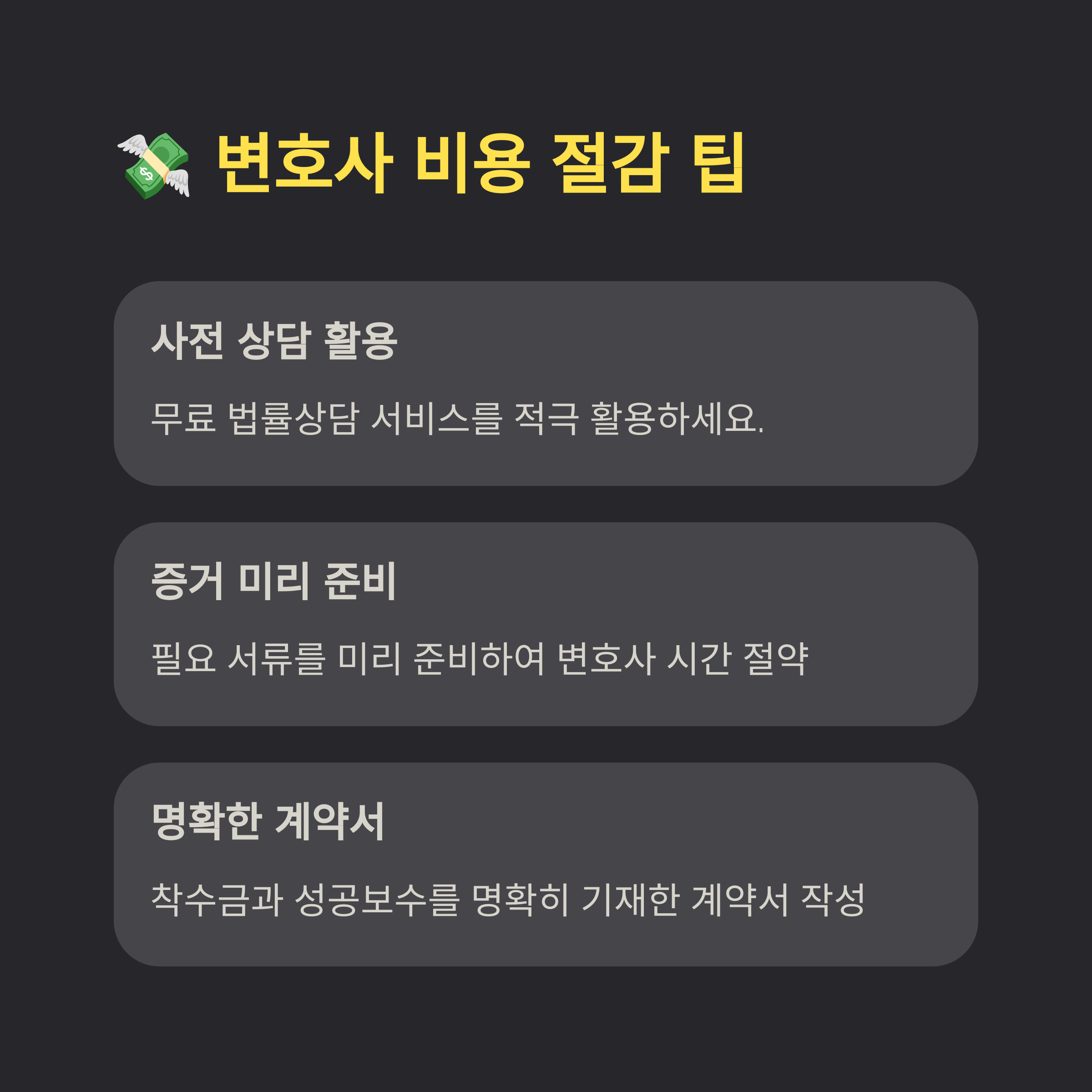 | 비용 협의 | 변호사와 착수금/성공보수 비율 등 협의 | 합리적인 비용 책정 |