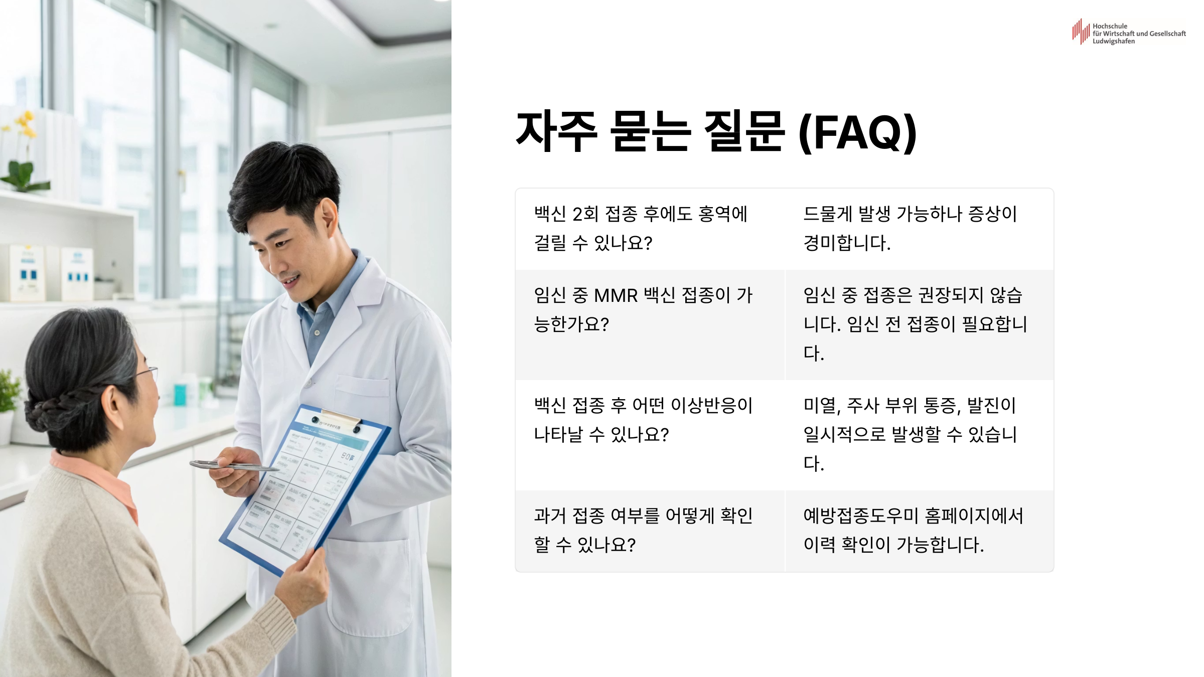 또한 산모와 임신 전 여성을 위한 MMR 접종도 일부 보건소에서 무료 지원되고 있어요. 단, 임신 중에는 생백신 접종이 불가능하니 임신 전 접종이 반드시 필요해요. 접종 후 최소 1개월은 피임도 병행해야 해요.