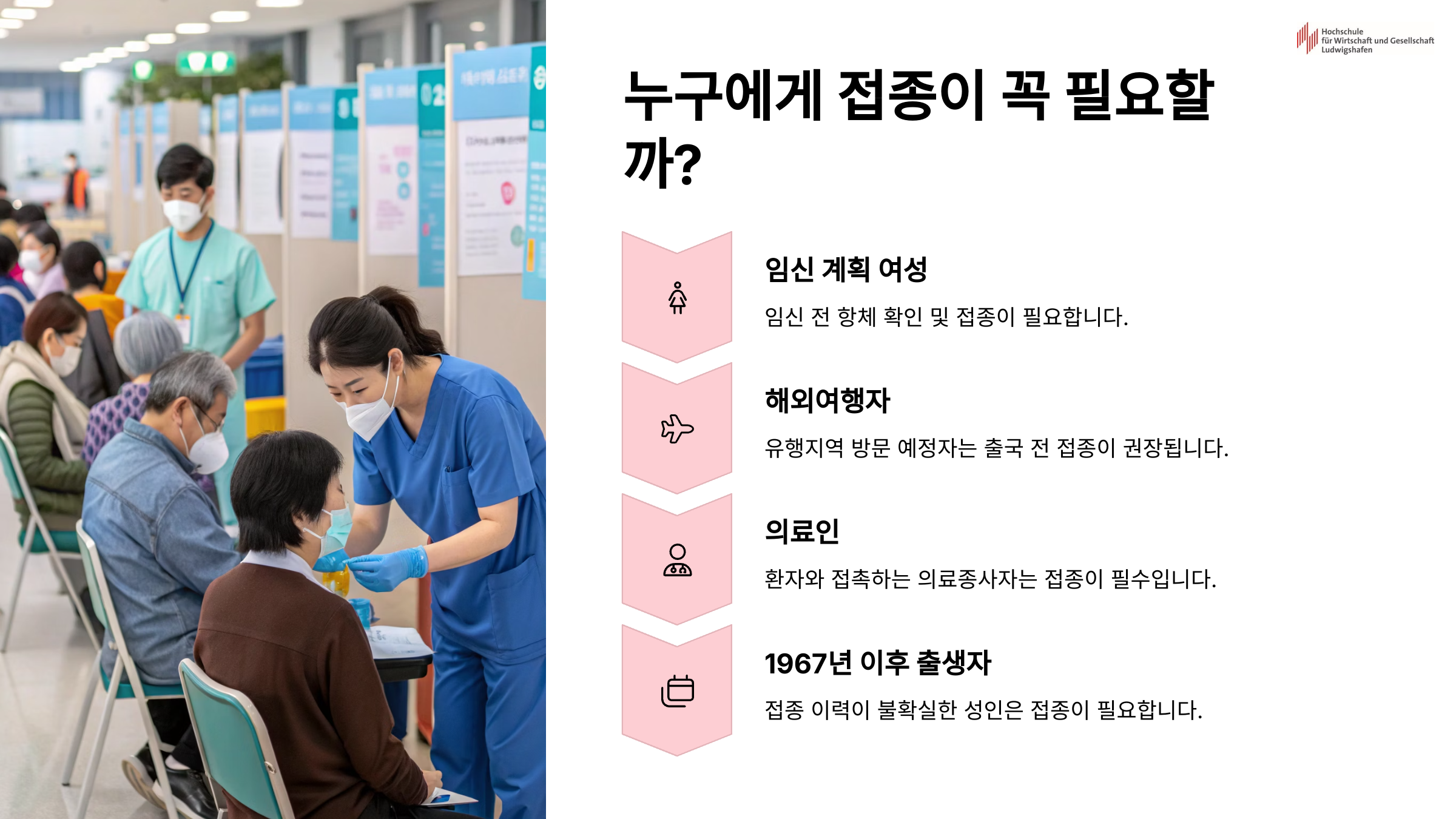 감염 위험군에는 유아, 20~40대 미접종 성인, 군 복무자, 대학 신입생, 항공사 종사자, 의료기관 근무자 등이 있어요. 특히 1994년 이전에 태어난 일부 연령대는 백신 접종 기록이 불분명한 경우가 많아서 반드시 확인이 필요해요.