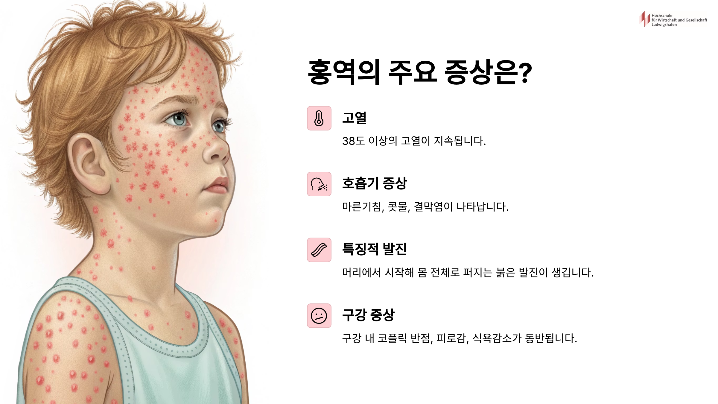 감염자의 기침, 재채기, 말소리를 통해 바이러스가 퍼지기 때문에 유치원, 학교, 병원처럼 사람이 많이 모이는 장소는 특히 더 위험하죠. 한번 걸리면 고열, 기침, 콧물, 발진 등 여러 증상이 동반되며 회복까지도 긴 시간이 걸려요. 제대로 치료받지 않으면 폐렴, 뇌염 같은 합병증으로 이어질 수 있어요.