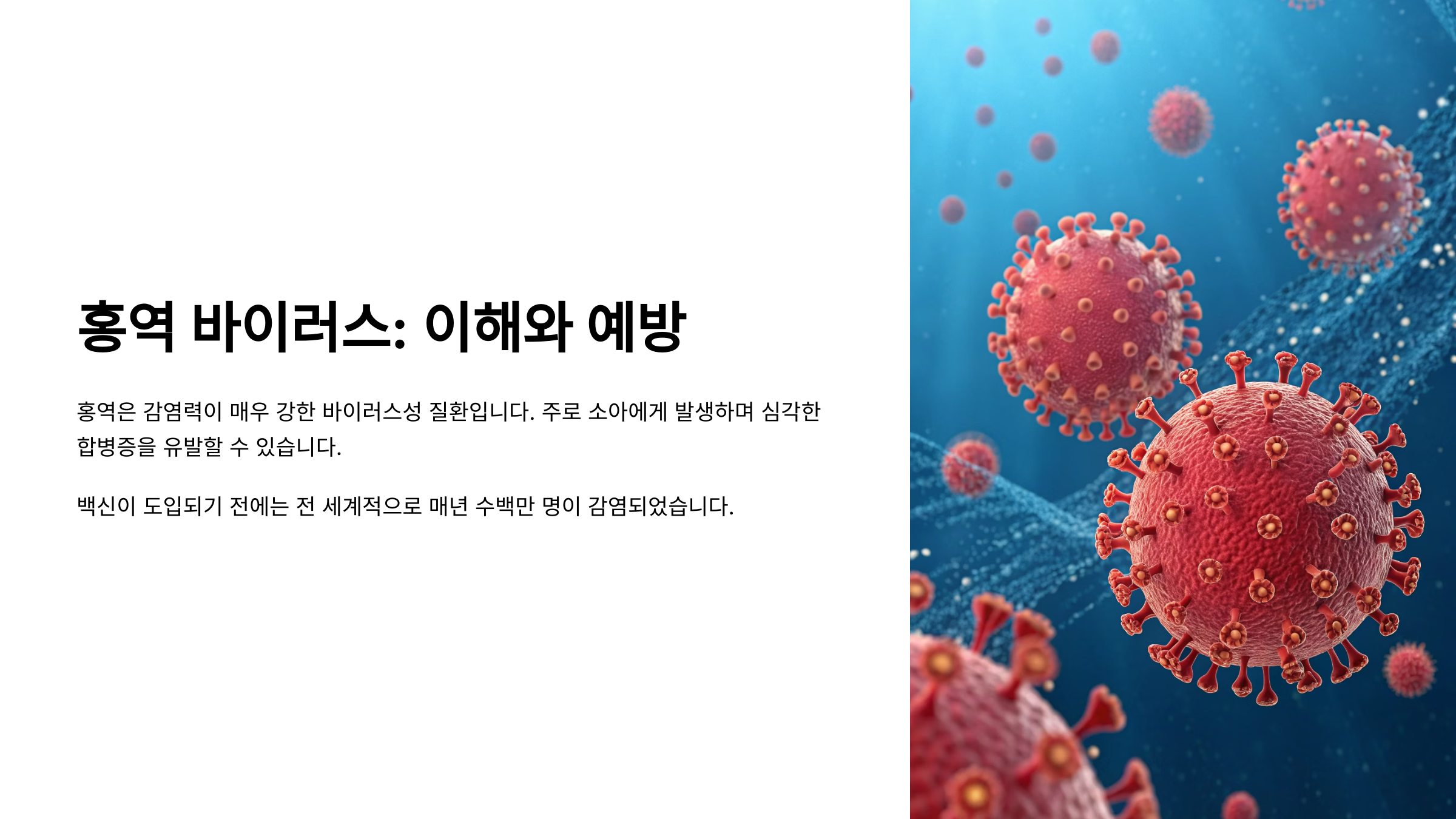 홍역은 ‘홍역 바이러스’라는 고전적 바이러스에 의해 발생하는 전염성이 매우 강한 질병이에요. 이 질병은 공기를 통해 아주 쉽게 퍼지기 때문에, 한 명만 감염돼도 주변 사람들의 대규모 감염으로 이어질 수 있어요. 특히 어린아이들이나 면역력이 약한 사람들에게는 치명적인 합병증을 일으킬 수 있어서 반드시 예방이 필요하답니다.