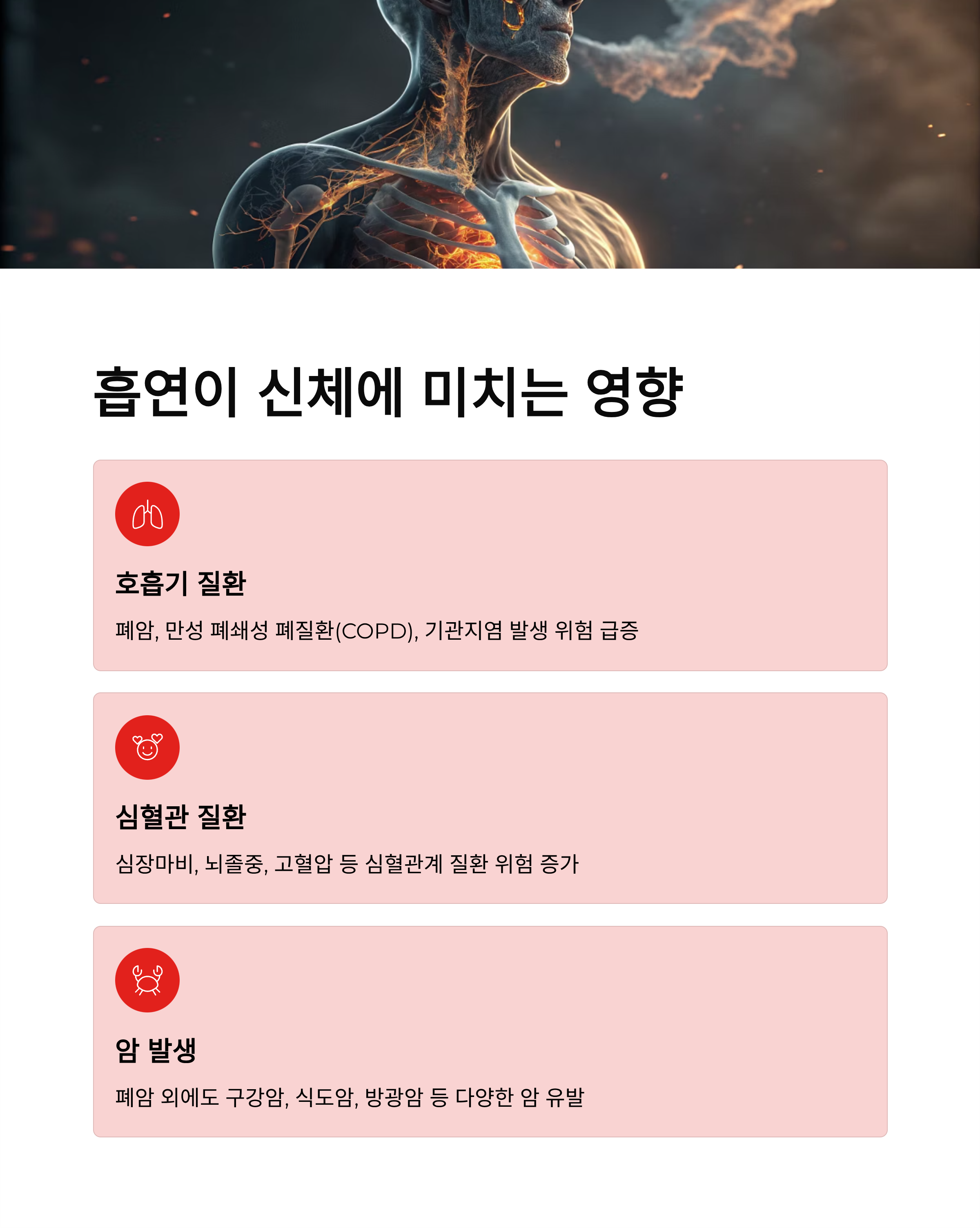 흡연 영향 각종 암, 심혈관/호흡기 질환, 소화기 문제, 피부 노화, 골다공증, 정신 건강 악화, 간접흡연 피해 담배는 70종 발암 물질, 7,000종 유해 물질 포함,