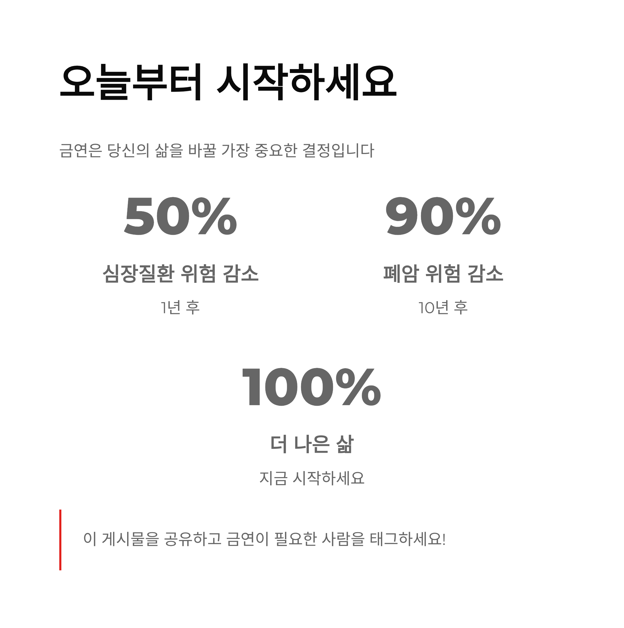 | 금연 효과 | 20분 후 혈압/맥박 정상화, 2주 후 폐 기능 30%↑, 1년 후 심장마비 위험 50%↓, 10년 후 폐암 위험 50%↓ | 시간이 지남에 따라 신체 회복 가속화, 빠르면 빠를수록 수명 연장 효과 ↑ |